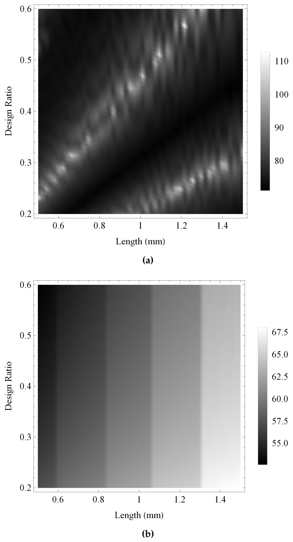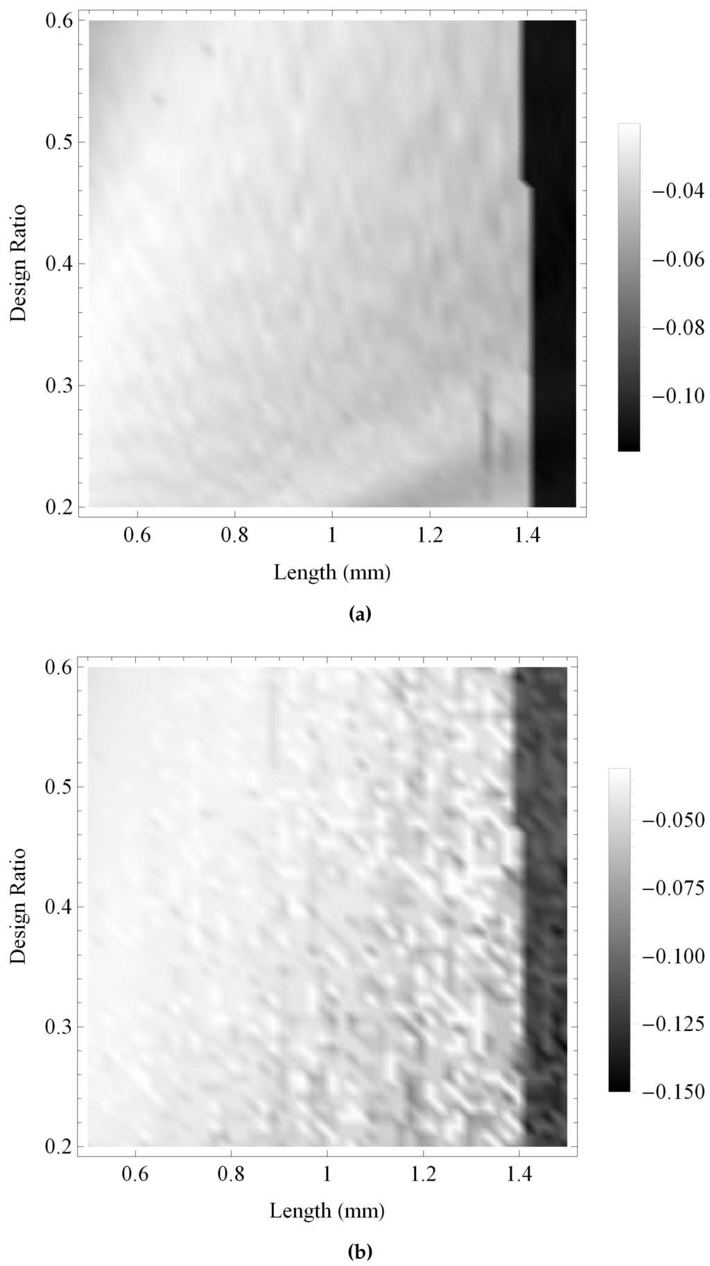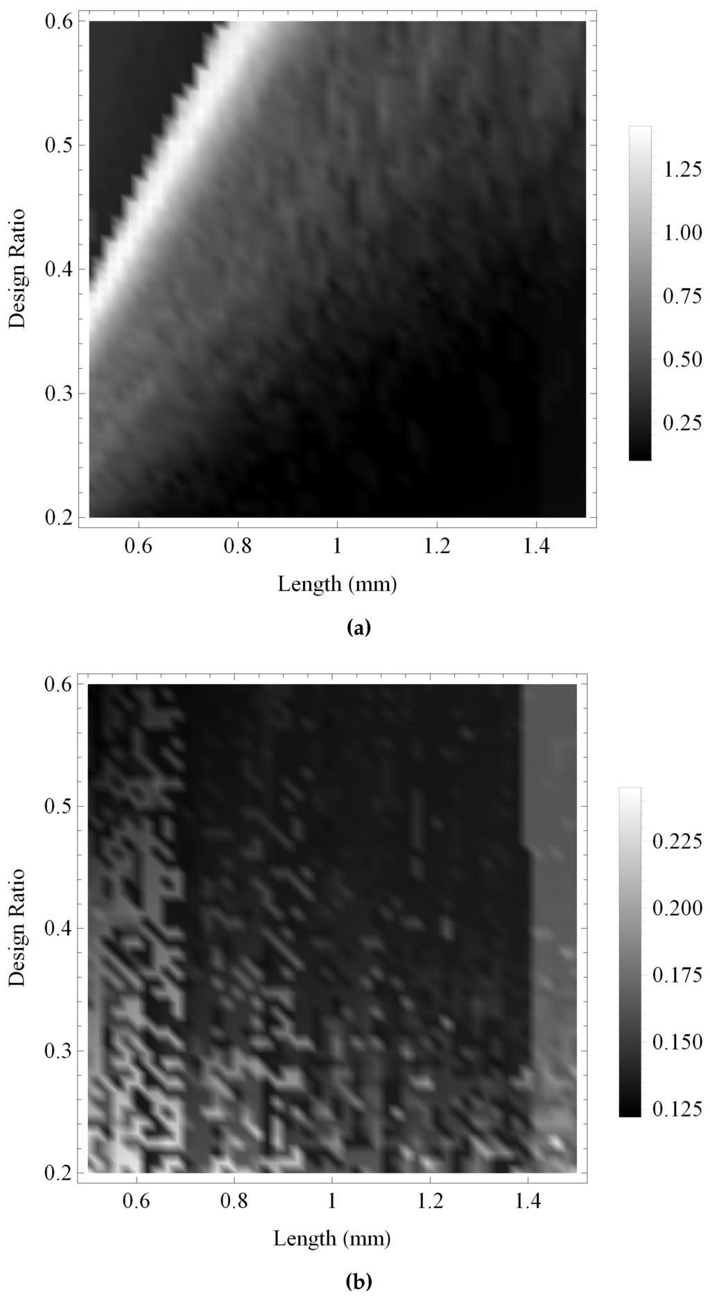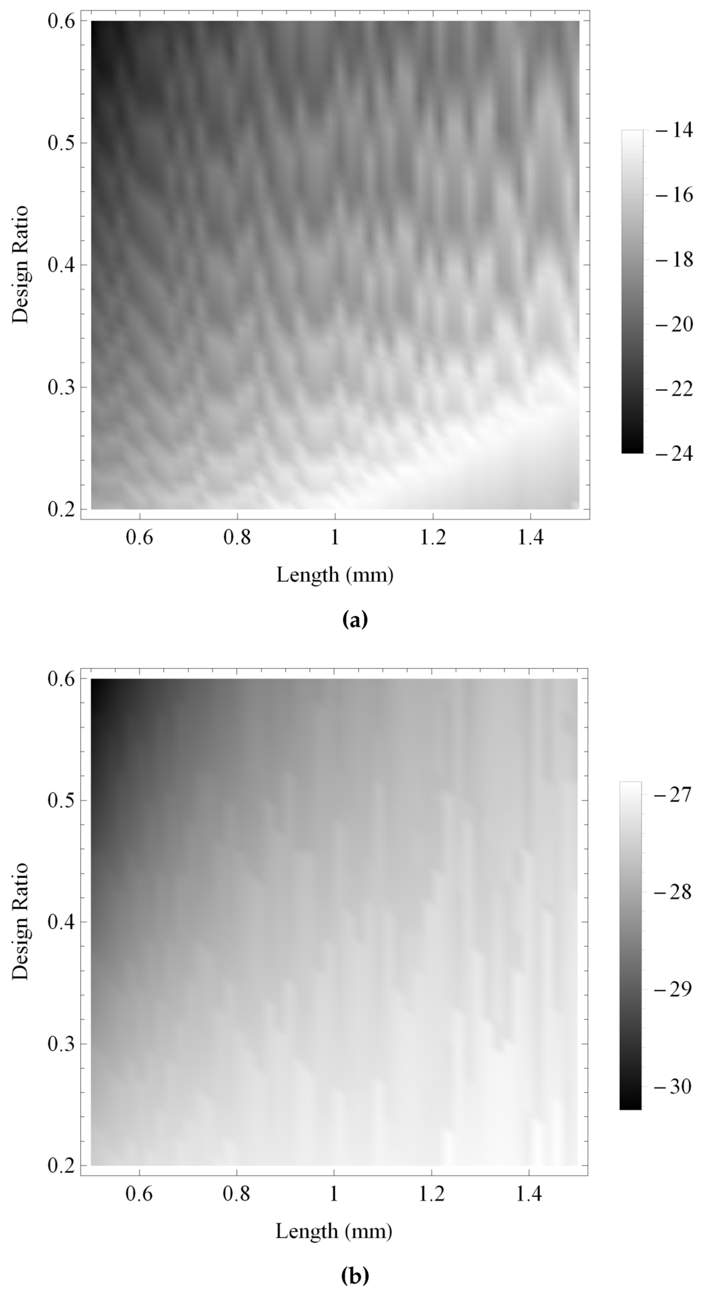 Figure 13 and Figure 14 show the maximum gain and the bandwidth, respectively, of the pulse-echo sensitivity for the fractal and the standard Euclidean transducers. As with previous investigations, the maximum gain obtained by the fractal transducer is shown to be consistently larger than the standard (Euclidean) transducer in Figure 13, displaying an intricate performance surface with numerous regions of high performance throughout the design space and a general trend of higher performance towards regions of lower ξ and higher L. The bandwidth performance for the standard (Euclidean) design is shown in Figure 14b to be relatively consistent throughout the design space, with regions of highest performance for lower values of L. In comparison, the fractal transducer is shown to obtain higher bandwidths throughout the majority of the design space, with highest performance for lower L and ξ and two bands of comparatively lower performance in regions of lower L and higher ξ.