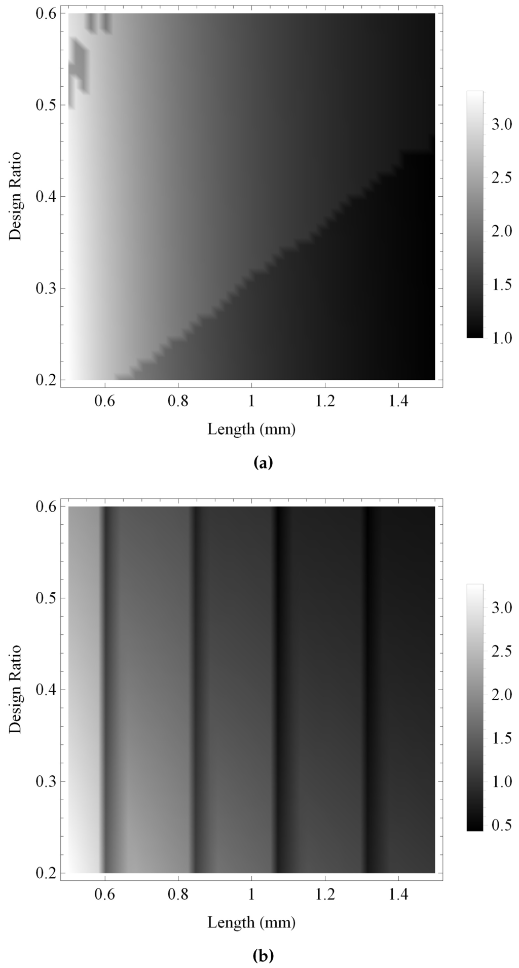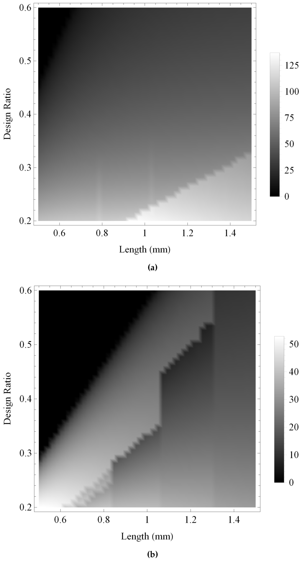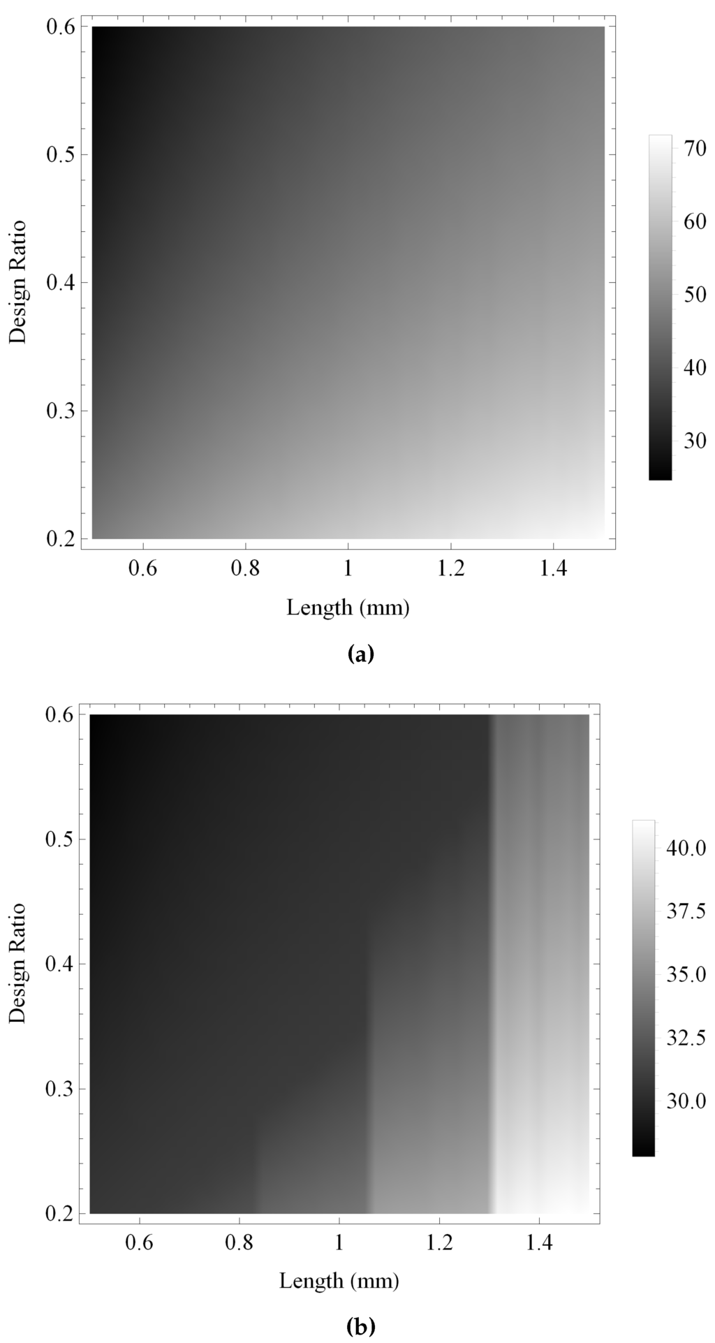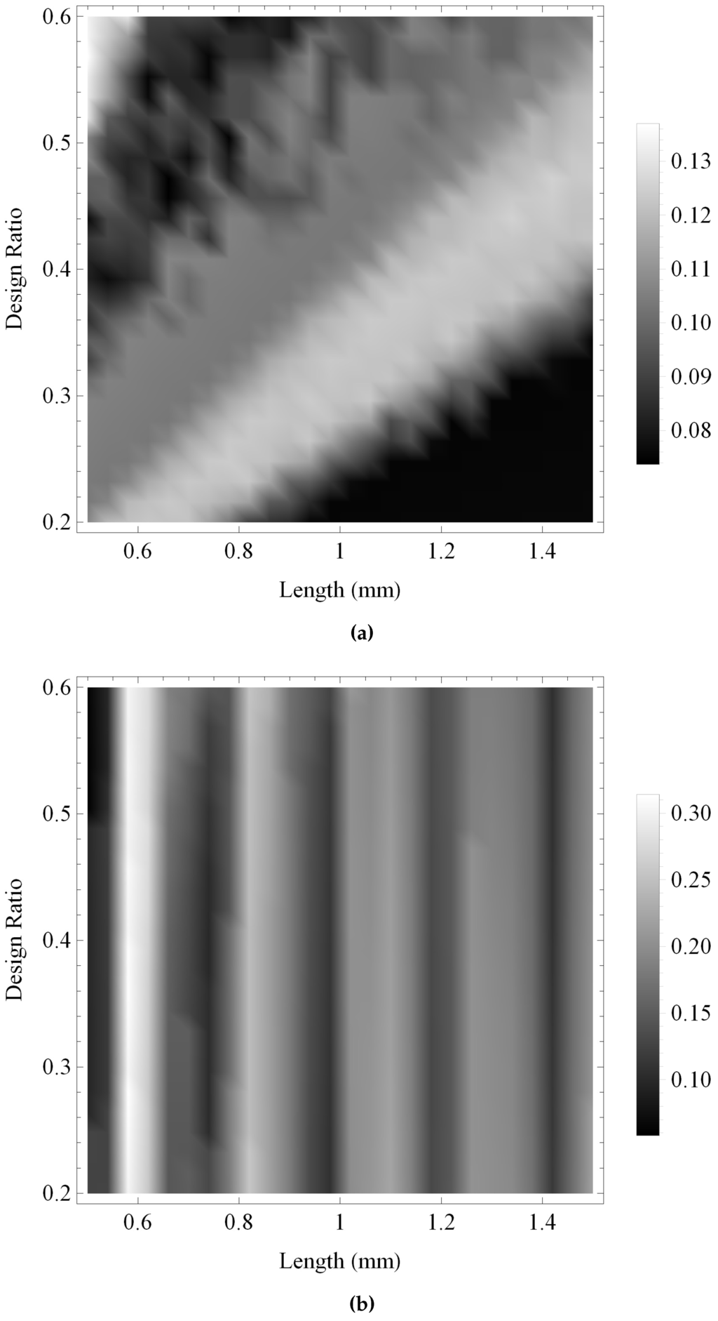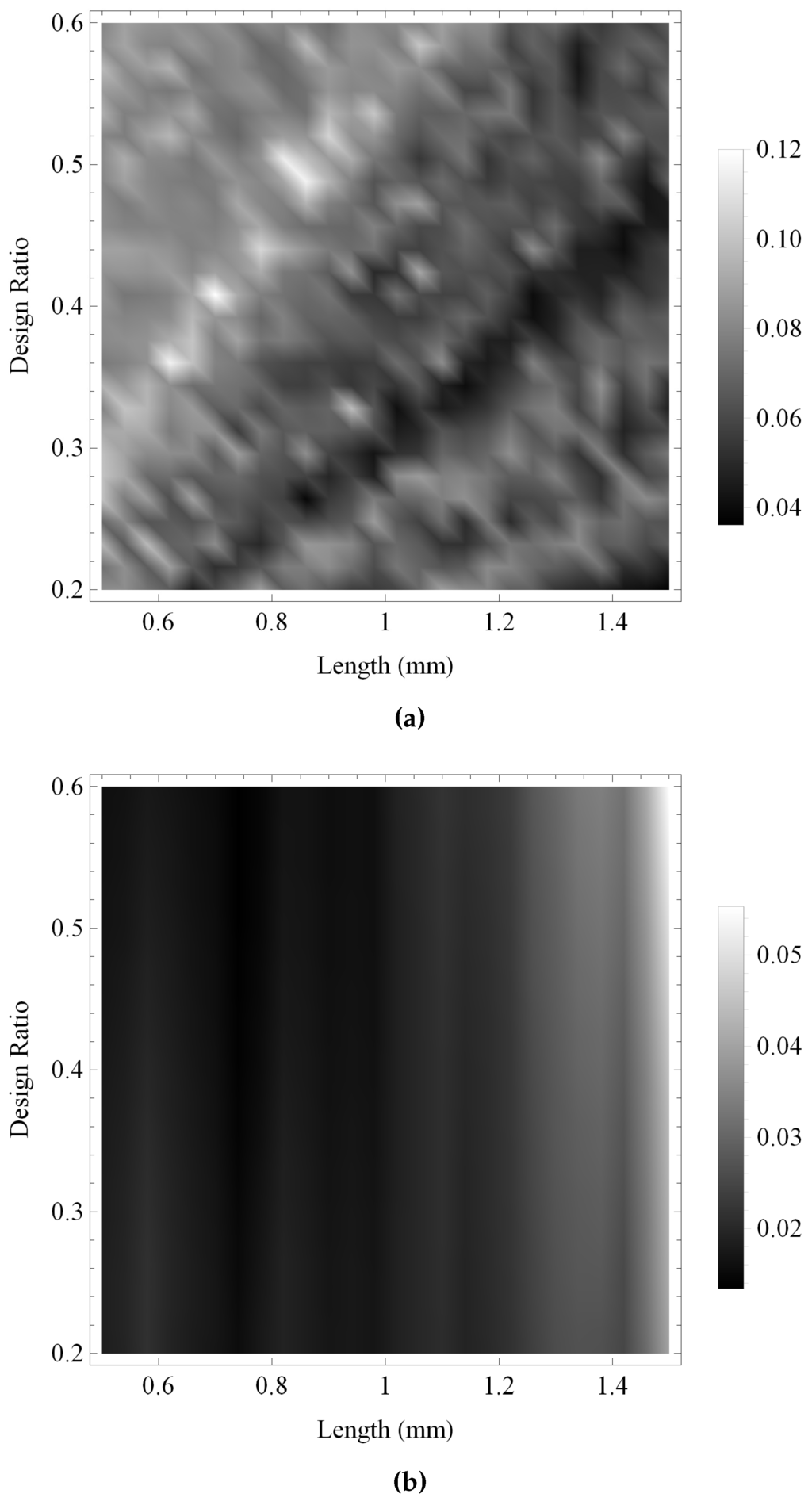 Figure 13 and Figure 14 show the maximum gain and the bandwidth, respectively, of the pulse-echo sensitivity for the fractal and the standard Euclidean transducers. As with previous investigations, the maximum gain obtained by the fractal transducer is shown to be consistently larger than the standard (Euclidean) transducer in Figure 13, displaying an intricate performance surface with numerous regions of high performance throughout the design space and a general trend of higher performance towards regions of lower ξ and higher L. The bandwidth performance for the standard (Euclidean) design is shown in Figure 14b to be relatively consistent throughout the design space, with regions of highest performance for lower values of L. In comparison, the fractal transducer is shown to obtain higher bandwidths throughout the majority of the design space, with highest performance for lower L and ξ and two bands of comparatively lower performance in regions of lower L and higher ξ.