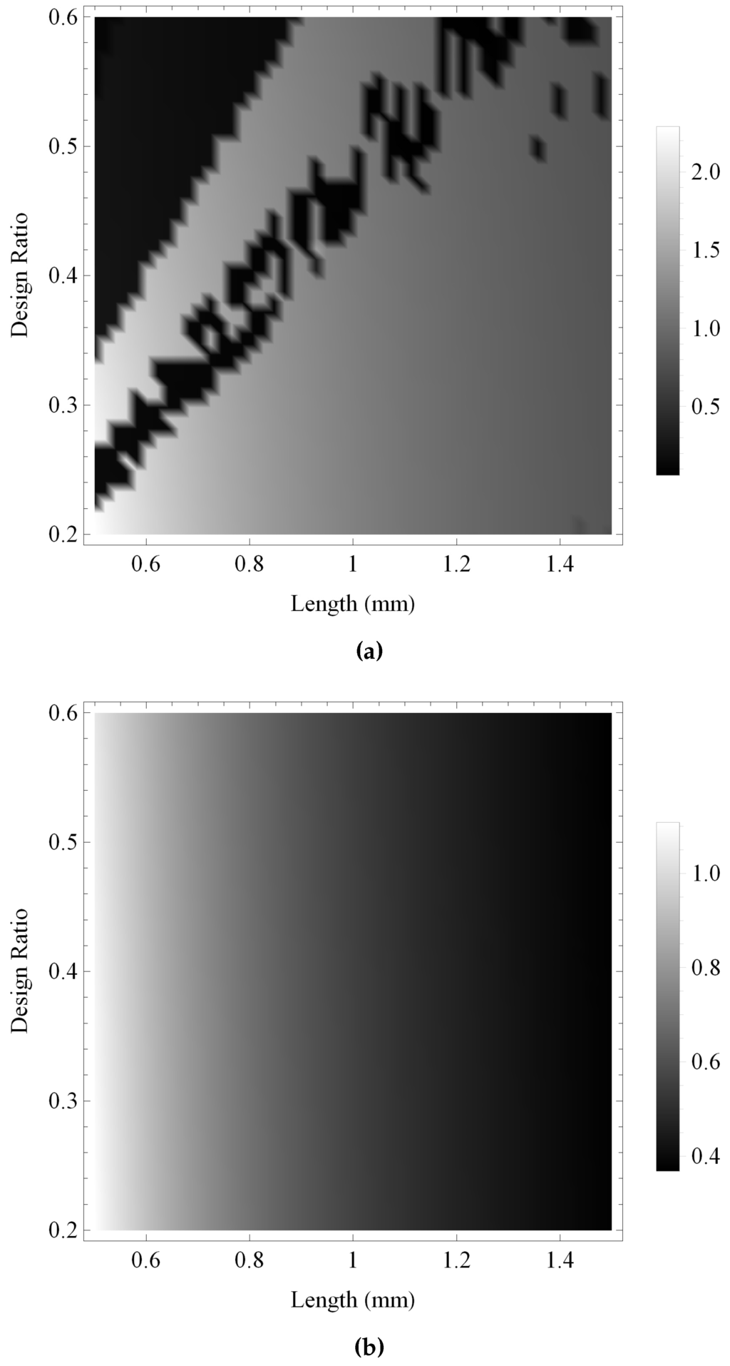 In Figure 18 the uncertainty in the bandwidth performance of each transducer in reception mode is compared. There are regions of extremely high uncertainty for both transducers, where the skewed distribution of the bandwidth values results in extremely large coefficients of variation. These large uncertainties arise in regions where the amplitude of the gain is less than the noise floor level, and therefore no bandwidth is recorded, for the majority of realisations of the material parameter values. A small number of these realisations produce a gain marginally above the noise floor level, however, and a small number of non-zero bandwidths are therefore recorded and skew the resulting mean bandwidth values. To aid the display of these results, Figure 18a,b have both been thresholded at a coefficient of variation of one; however the maximum coefficient of variation is over seven in each case. For the fractal transducer the regions of high uncertainty are associated with the regions of extremely low bandwidth, and there is comparatively low uncertainty throughout the higher performance regions. In contrast, the regions of high uncertainty are widespread for the standard Euclidean transducer and coincide with regions of higher performance.