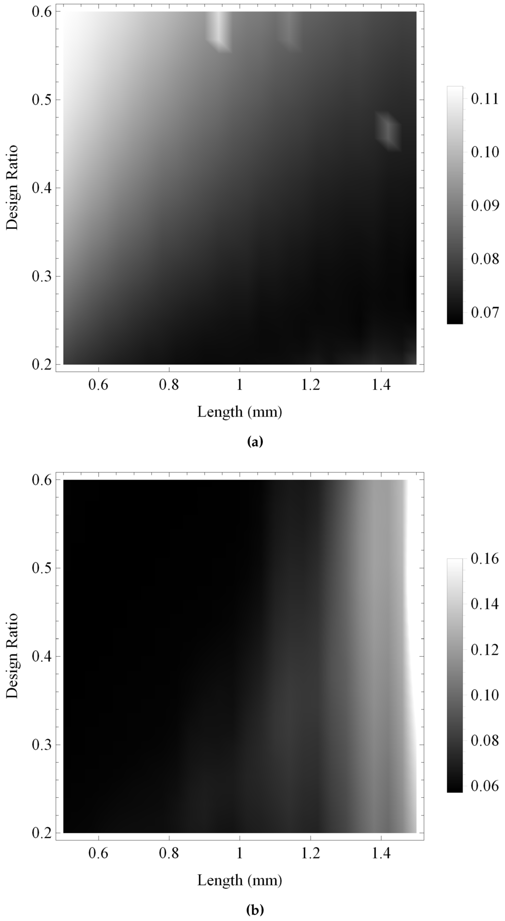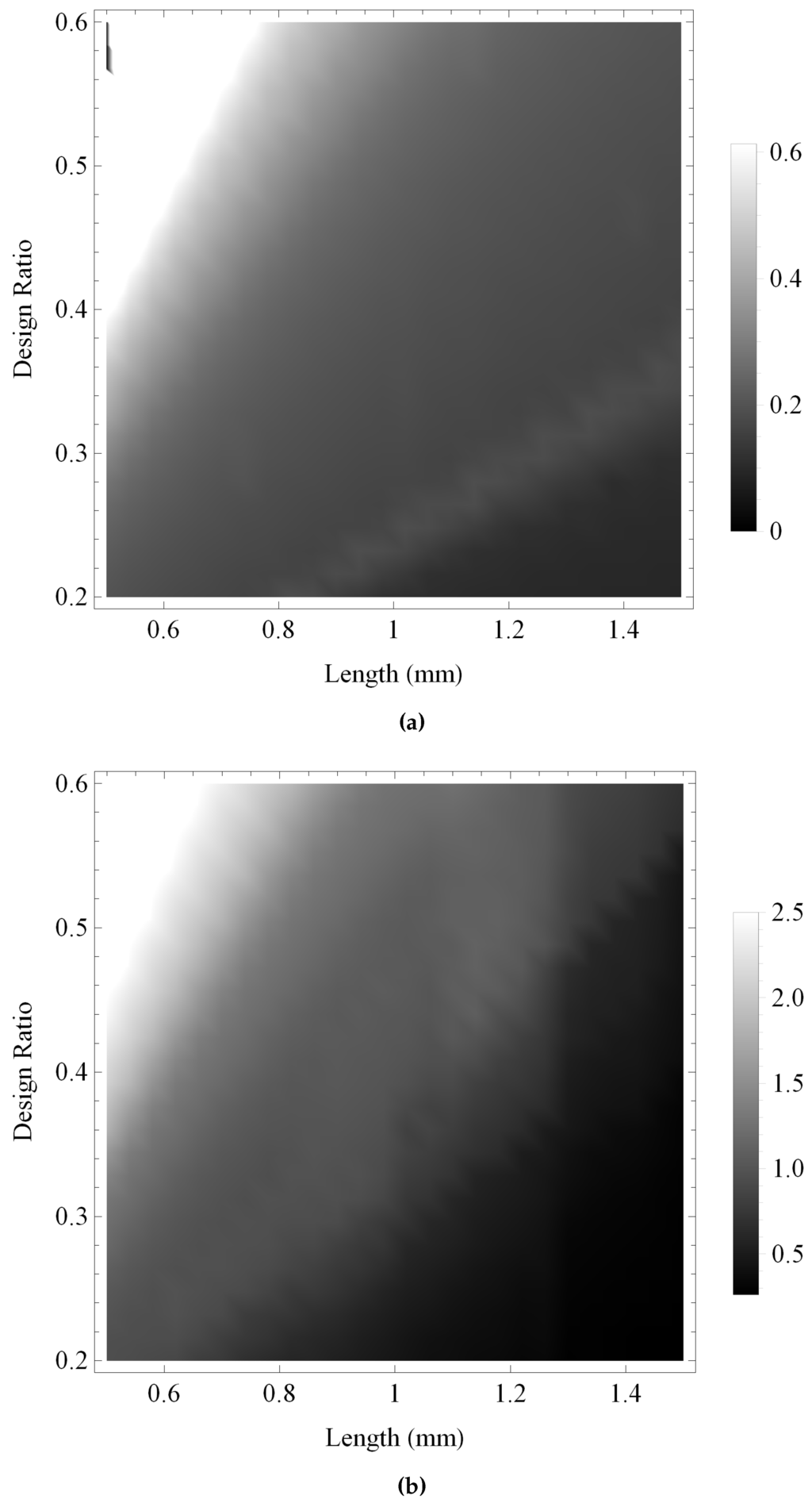Variation of the maximum gain for the reception sensitivities calculated over ranges of the design parameters ξ and L: (a) the Sierpinski gasket lattice transducer at fractal generation level ; and (b) the standard (Euclidean) transducer. Parameter values are given in Auld [] for PZT-5H.