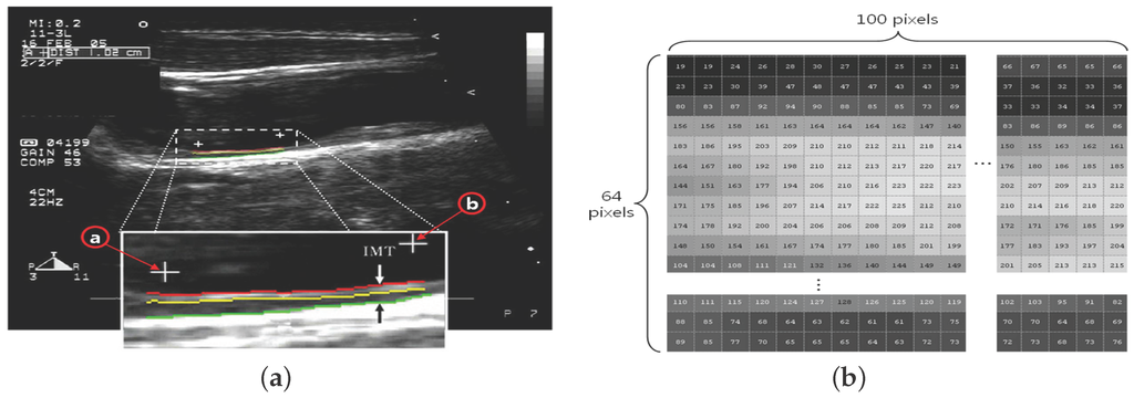 - The ROI image with pixels is acquired by defining the area of two ’+’ markers (from to ) on the image of the carotid IMT in Figure 2a;