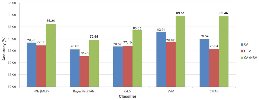 where, is True Positive, is True Negative, is False Positive, and is False Negative in the confusion matrix. In the performance evaluation with , and , Table 5 shows the features used for each data set which are CA, HRV and CA+HRV (combining CA and HRV).