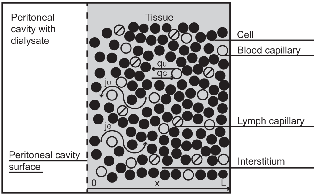Peritoneal dialysis is a life saving treatment for chronic patients with end stage renal disease [1]. The peritoneal cavity, an empty space that separates bowels, abdominal muscles and other organs in the abdominal cavity, is applied as a container for dialysis fluid, which is infused there through a permanent catheter and left in the cavity for a few hours. During this time small metabolites (urea, creatinine) and large molecules (e.g., albumin) diffuse from blood that perfuses the tissue layers close to the peritoneal cavity to the dialysis fluid, and finally are removed together with the drained fluid. The treatment cycle (infusion, dwell, drainage) is repeated several times every day. The peritoneal transport occurs between dialysis fluid in the peritoneal cavity and blood passing down the capillaries in the tissue surrounding the peritoneal cavity (see Figure 1, in which a symmetrical structure of the tissue with respect to the cavity is assumed). Typically, many solutes are transported from blood to dialyzate, but some solutes such as for example an osmotic agent (glucose), which is present in a high concentration in dialysis fluid, are transported in the opposite direction, i.e., to the blood.