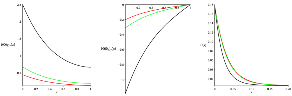 The results are presented in Figure 3 (all of the curves presented in the paper were constructed using the package Maple 17). As one may note three different values of the Staverman reflection coefficient were used. Figure 3 presents the spatial distributions of the steady-state density of the fluid flux from blood to the tissue and the fluid flux across the tissue , calculated using Formulae (46)–(50). Negative values of indicate that the net fluid flux occurs across the tissue towards the peritoneal cavity. Therefore it corresponds to the water removal by ultrafiltration. The monotonically decreasing (with the distance from the peritoneal surface) function and the monotonically increasing function are in agreement with the experimental data and previously obtained numerical results for the models that took into account only the glucose transport (see for the details [5,10] and the references cited therein).