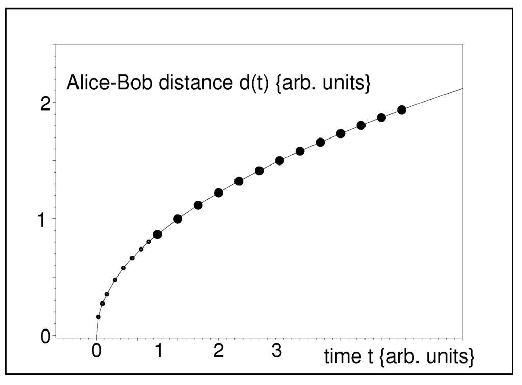 Hypothetically, Alice and Bob may have started their experiment very early after the Big Bang. In such a case one should recall the principle of classical-quantum correspondence and replace the real curve by the pencil of self-adjoint operators defined in the above-mentioned alternative physical Hilbert space . In Heisenberg picture (and, say, in pure state), the wave function of the Alice’s and Bob’s Universe will be time-independent while, under adiabatic hypothesis, their measured distance will smoothly continue the classical curve and, moreover, it will coincide, in the case of a luckily chosen quantum theory, with one of the eigenvalues of the toy-model operator .