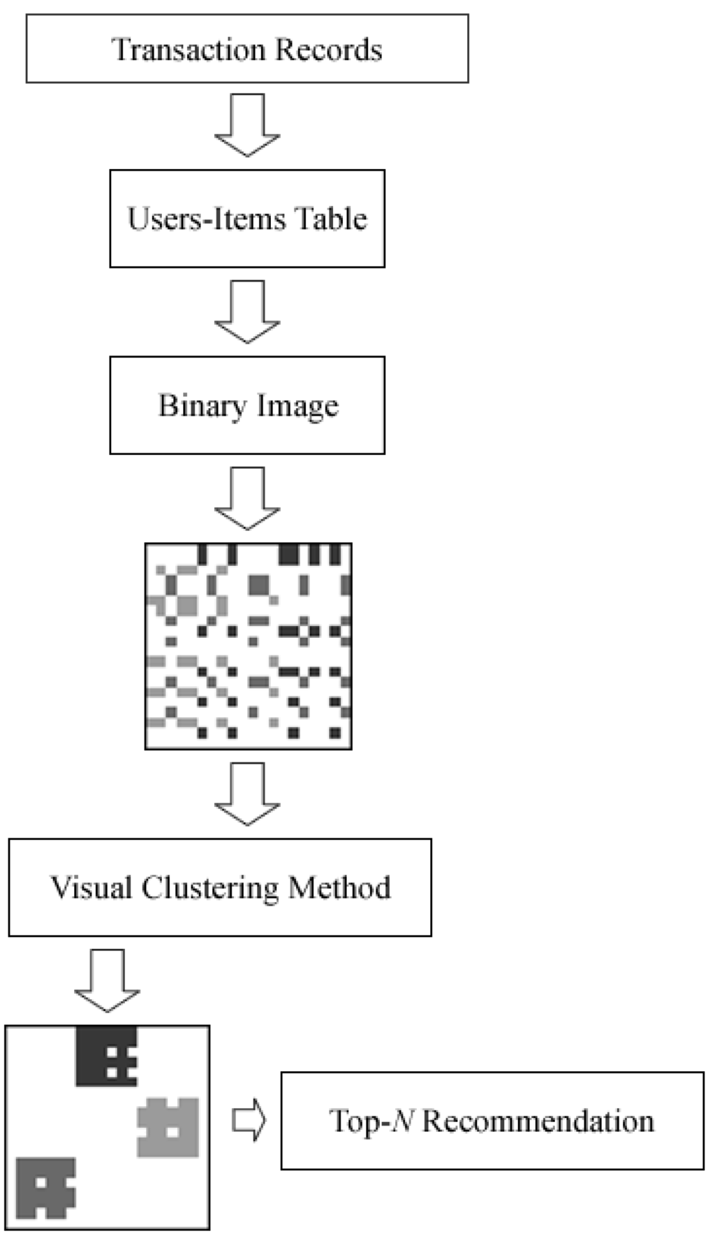 The model of the proposed top-N recommendation systems is shown in Figure 1. In the proposed methods, the process can be divided into three parts. Firstly, we create the user-item table from the purchased transaction as shown in Figure 2a. Then the user-item table is mapped into a binary image as respectively shown in Figure 2b. Secondly, we propose a method to cluster the users and items in the binary image. Finally, we develop methods for the RS based on the clustered image to recommend items to an active user.