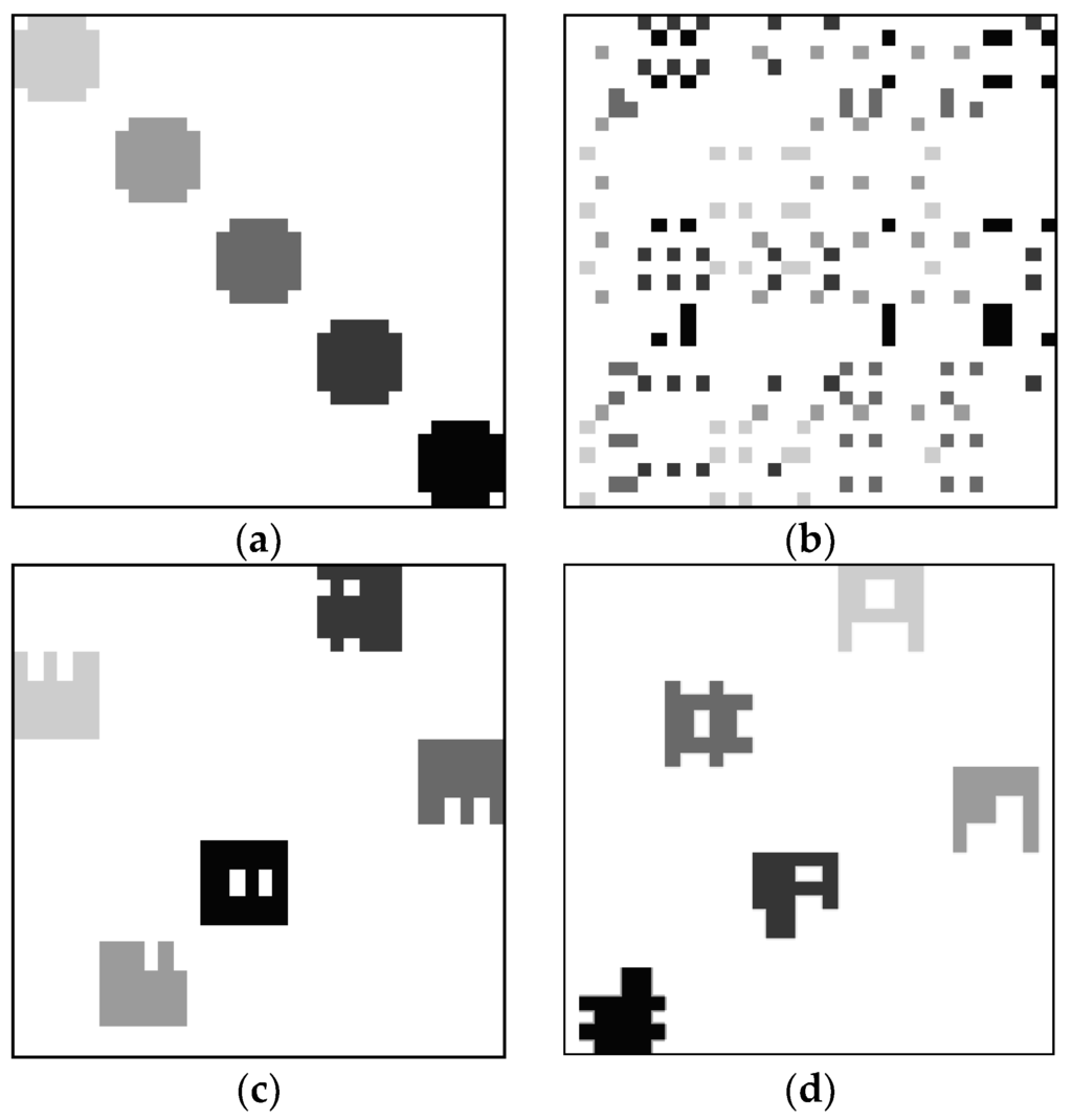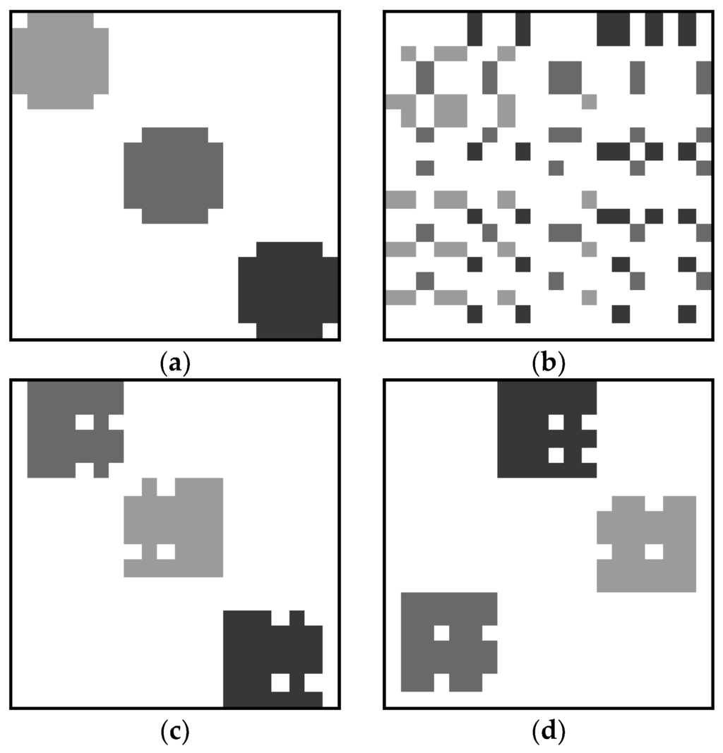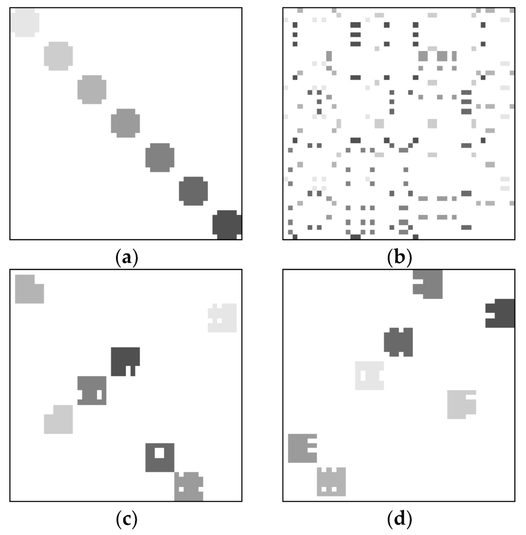 In real-world data sets, it is extremely difficult or impossible to evaluate whether a clustering method is able to properly cluster the users and items. Hence, three synthetic data sets were created to represent the data sets with prior known ground truth. Figure 4a, Figure 5a and Figure 6a show the original binary images containing three, five, and seven clusters, respectively. It should be noted that all three original images are actually binary. The gray level versions are shown here so that we can visualize the clustering performances. To indicate the elements in the same or different cluster, we label elements in the same cluster using the same gray level. For the elements in different clusters, the gray levels are different. Figure 4b, Figure 5b and Figure 6b show the corresponding images after randomly interchanging rows and columns. After applying our previously proposed VCM [39], the clustering results are shown in Figure 4c, Figure 5c and Figure 6c, respectively. Furthermore, the results using our presently proposed VCM are shown in Figure 4d, Figure 5d and Figure 6d, respectively. It can be clearly seen that both VCMs achieve three, five, and seven clusters, respectively. Although the shape and location of each cluster is different from the original one due to changes of rows and columns, the members in each cluster are the same as that in the original image. This emphasizes that the VCMs are able to properly cluster the users and items in a binary image.