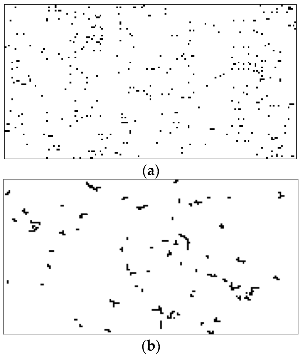 αi is defined as in Equation (2) to deal with the number of clusters. βi is used to deal with the number of small clusters. The number of small clusters in the ith image is denoted by Ns,i. We do not want to have many small clusters, therefore Ns,i should be small. In this research, the clusters with less than four pixels are considered as small clusters. The size of a large cluster (though it does not need to be the largest cluster) is taken into account in γi. Pl,i denotes the number of pixels in the large cluster in the ith image. In this research, Pl,i is the number of pixels of the third largest cluster in the image. Similarly, the size of a small cluster (though not necessarily the smallest) is taken into account in δi. Ps,i denotes the number of pixels in the small cluster in the ith image. In this research, Ps,i is the number of pixels of the smallest cluster with larger than three pixels. It is worth noting that the values of Pl,i and Ps,i are not from the largest and smallest clusters, but the order-statistics are utilized instead. This is to provide more robustness in term of the size variation. The bottom line is that the fitness value will be large when pixels in the image are well-clustered (small αi), the number of small clusters is small (small βi), the third largest cluster is large (large γi), and the smallest cluster with more than three pixels is large (large δi).