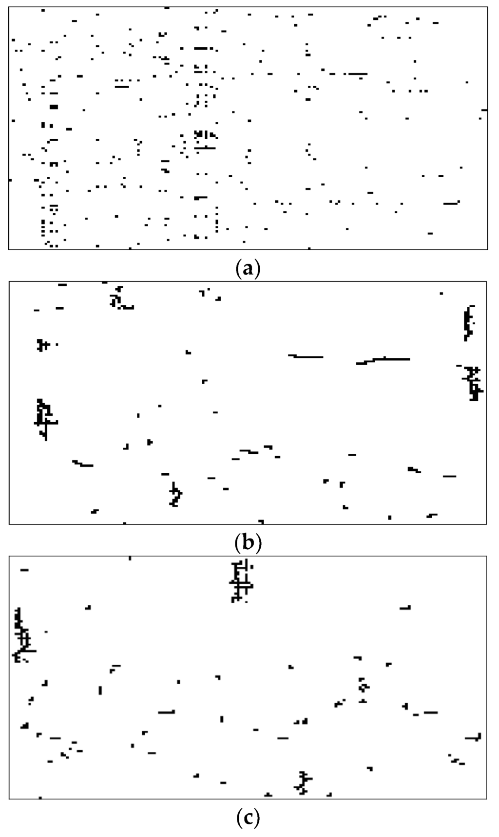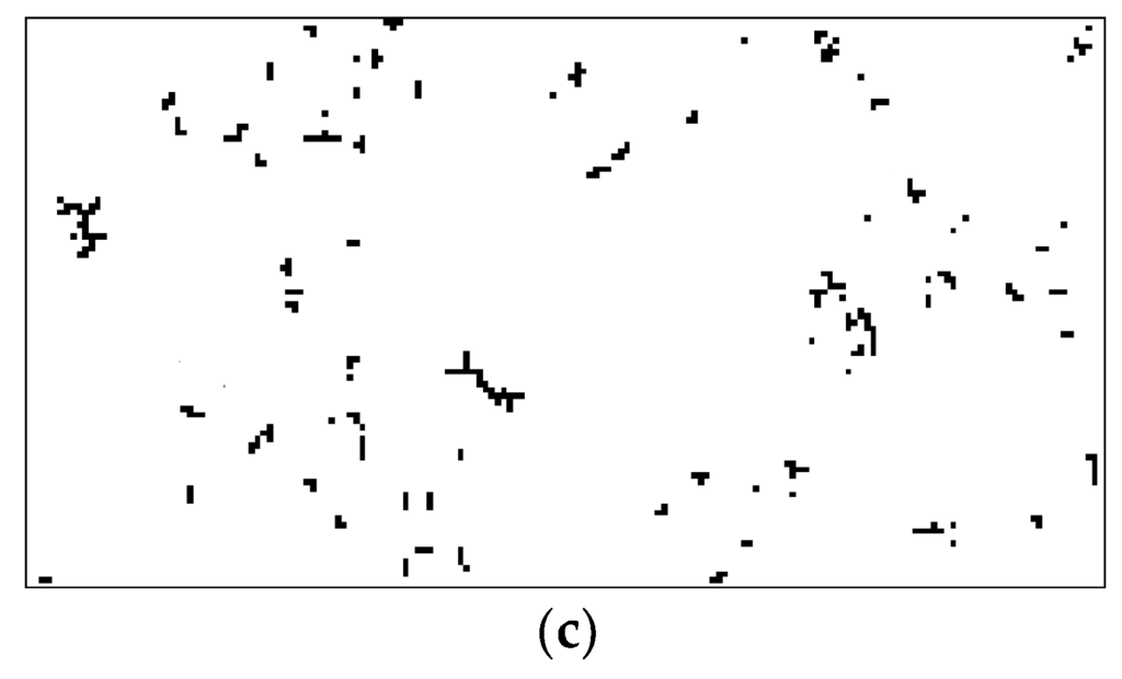 The clustering results using the VCMs on the three synthetic data sets confirm that both proposed VCMs are able to cluster the information in binary images. The VCMs are then applied to cluster the users and items in the four real-world data sets. We show only the clustering results from the first two data sets. Figure 7a shows the original KDD image. The clustering results using our previously proposed VCM and the presently proposed VCM are shown in Figure 7b,c, respectively. Figure 8a shows the original TTS image, whereas the corresponding clustering results using our previously proposed VCM and the presently proposed VCM are shown in Figure 8b,c, respectively. The results clearly show that the VCMs are able to cluster the users and items in the two real-world data sets as the resulting images have much less numbers of clusters than those in the corresponding original images. The information in the derived clusters can be used in the RSs.