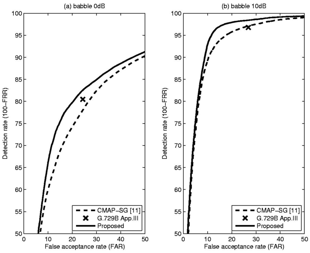 (a) Receiver operating characteristics (ROC) curve for the babble at 0 dB SNR; (b) ROC curve for the babble at 10 dB SNR.