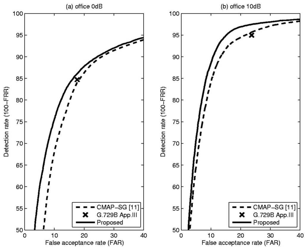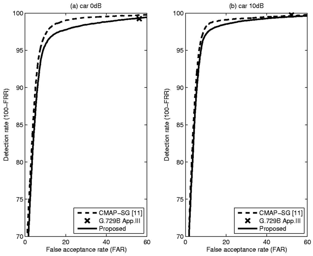 Table 1 shows comparative results, including total error rate (TER), false rejection rate (FRR) and false acceptance rate (FAR), for the proposed method and the CMAP-SG algorithm [11] which is an LR-based VAD algorithm that incorporates spectral variation. In addition, to show that the performance of the proposed method is acceptable in practice, the result of the well-known standard VAD algorithm, ITU-T G.729B Appendix III, is included for each condition [12]. From these results, it is evident that the proposed VAD algorithm outperformed or was comparable to conventional methods in terms of overall detection accuracy under the given noise conditions. This fact could be confirmed by Figure 3, Figure 4 and Figure 5, showing the receiver operating characteristics (ROC) that are insensitive to parameter tuning, since they are a trade-off between detection rate (100-FRR) and FAR [10]. Based on these characteristics, we can see the overall performance differences of the previously discussed methods. From the Figure 3, Figure 4 and Figure 5, the proposed TE-based VAD yielded higher or equivalent performance compared with the conventional method.