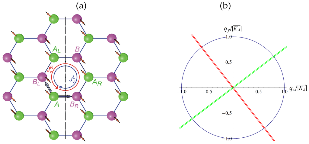 (a) graphene lattice, comprised of two sublattices with spin “up” and with spin “down” . Right and left valley currents and are shown as circular curves with arrows. Double arrows from site A to site and from A to indicate clockwise and anti-clockwise directions. The axis of mirror reflection from to is marked by dash-dotted line; (b) transformations of a q-circumference into ellipses under an action of exchange operators and (in color).