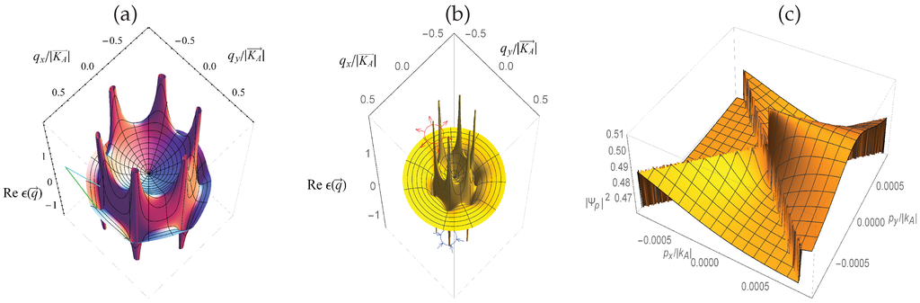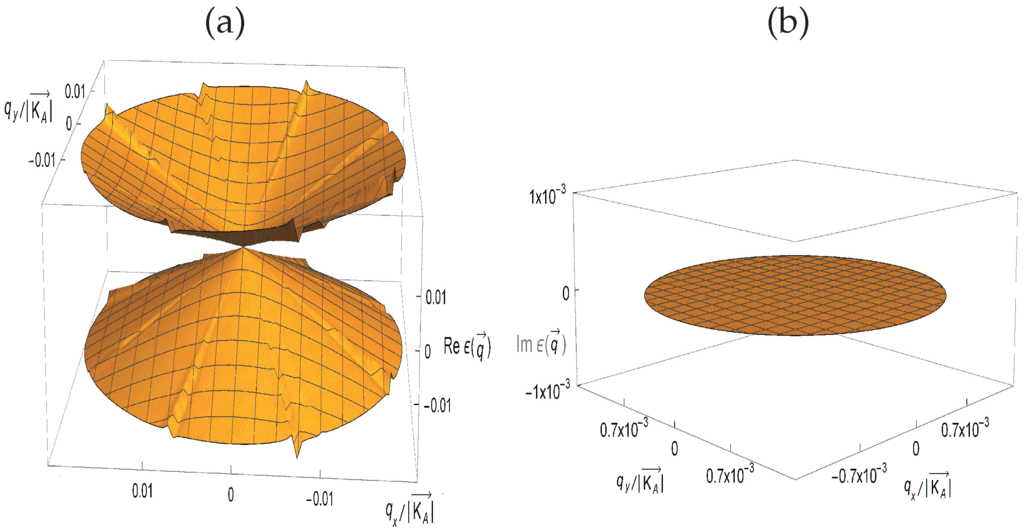 For a given , where the eigenfunction of Equation (9) represents 2D spinor Ψ, we choose its normalization in the form with lower component equal to unity. Then, as it can be easily shown for the massless Dirac pseudo-fermion model [47], the absolute value of the upper component does not depend upon the wave vector , demonstrating the equivalence of all directions in space. We construct for Equation (9) in -approximation for the exchange. The results are shown in Figure 2c. The isotropy of is broken for our model due to the appearance of the preferable directions in the momentum space.