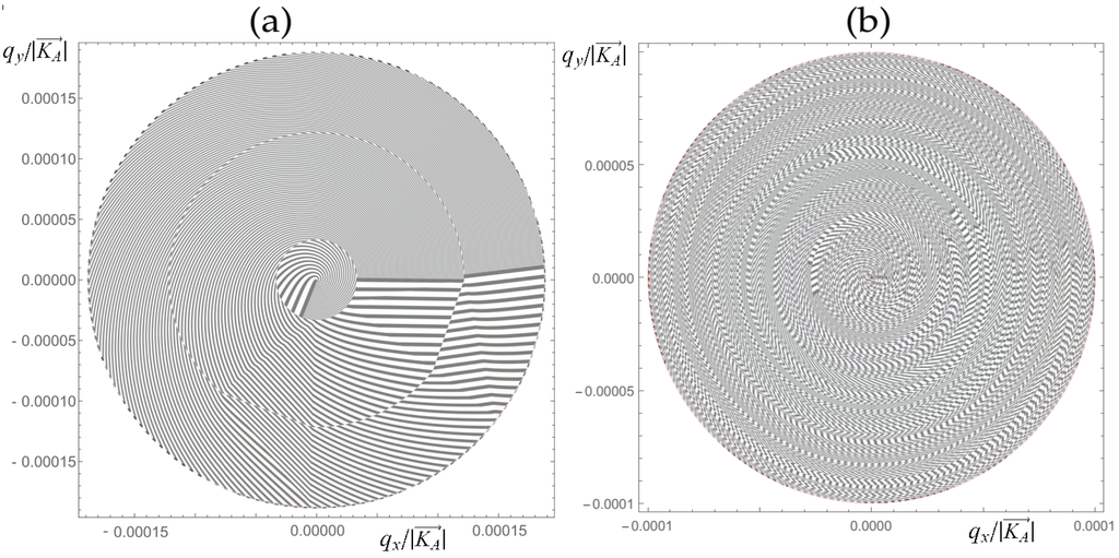 where and are radial components of the spin and the momentum, respectively. According to Equation (6), the pseudo-spin-orbit scalar describes the coupling (interaction) of the spin with the valley currents flowing along a closed loop clockwise or in opposite directions, as is shown in Figure 1a. Hence, there exists a preferred direction along which the spin projection of the bispinor (1) is not changed after transition from one moving reference frame into another. At this, the spin of a particle precesses. Transformation of the electron and hole into each other in an exciton is a pseudo-precession.