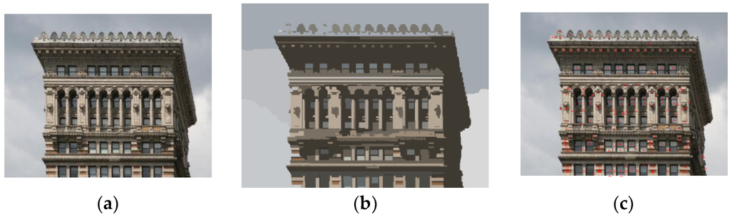 Results of Statistical Region Merging Segmentation (SRM). (a) the initial image; (b) detected image regions; (c) centroids of image regions.