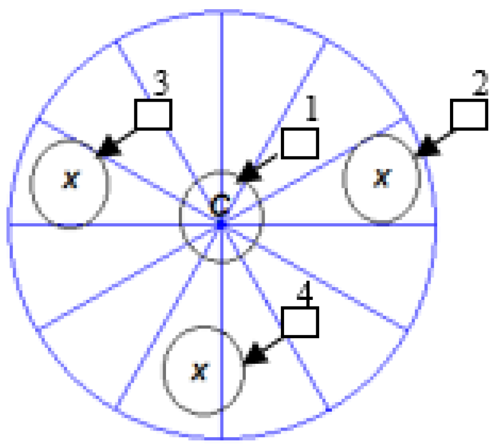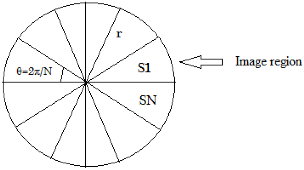 The image regions are divided into circular sectors of the surrounding circle. The algorithm defines N as the number of angular divisions equal to 12, and θ = 2π/N is the angle between adjacent sectors as shown in Figure 3. The radial partitions are labeled as S1, S2,…, S12. All 12 sectors are saved to find Harris corner points in the next subsection. In our method, we experimentally set the radius of circle region r = 8.