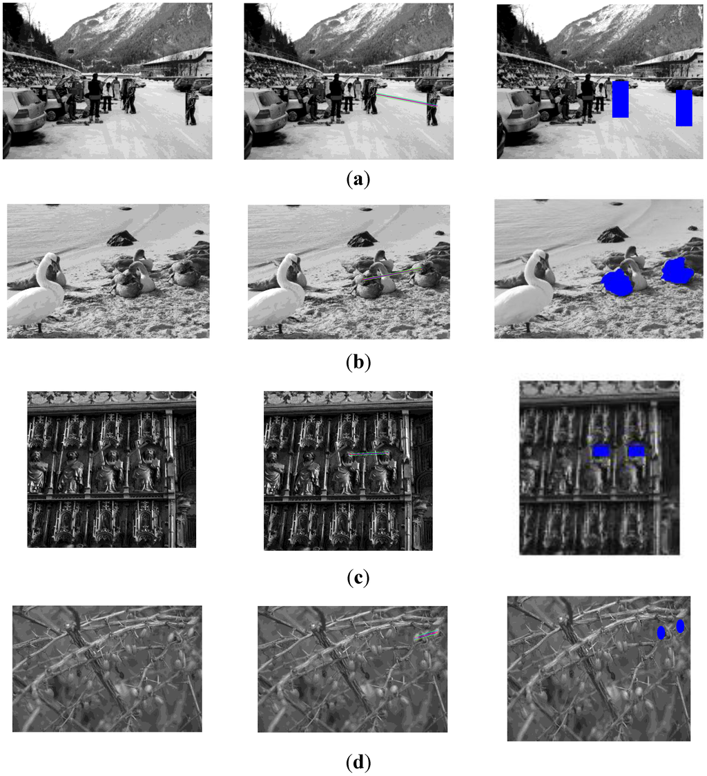 To test the robustness of our proposed method for detecting region duplication in the case of scaled duplicated regions, forged regions are scaled up or down with various scaling parameters (s = 0.8,0.9,1.1,1.2). One example of a visual result is shown in Figure 9. Furthermore, in order to quantitatively evaluate the robustness of our algorithm under different scaling factors, we randomly selected 50 original images from MICC-F220 image datasets [18]. For each original image and each duplicate region with square image blocks of sizes 64 × 64, 96 × 96 and 128 × 128 pixels. The detection performances of scaled duplicated regions for each image region size are presented in Table 5.