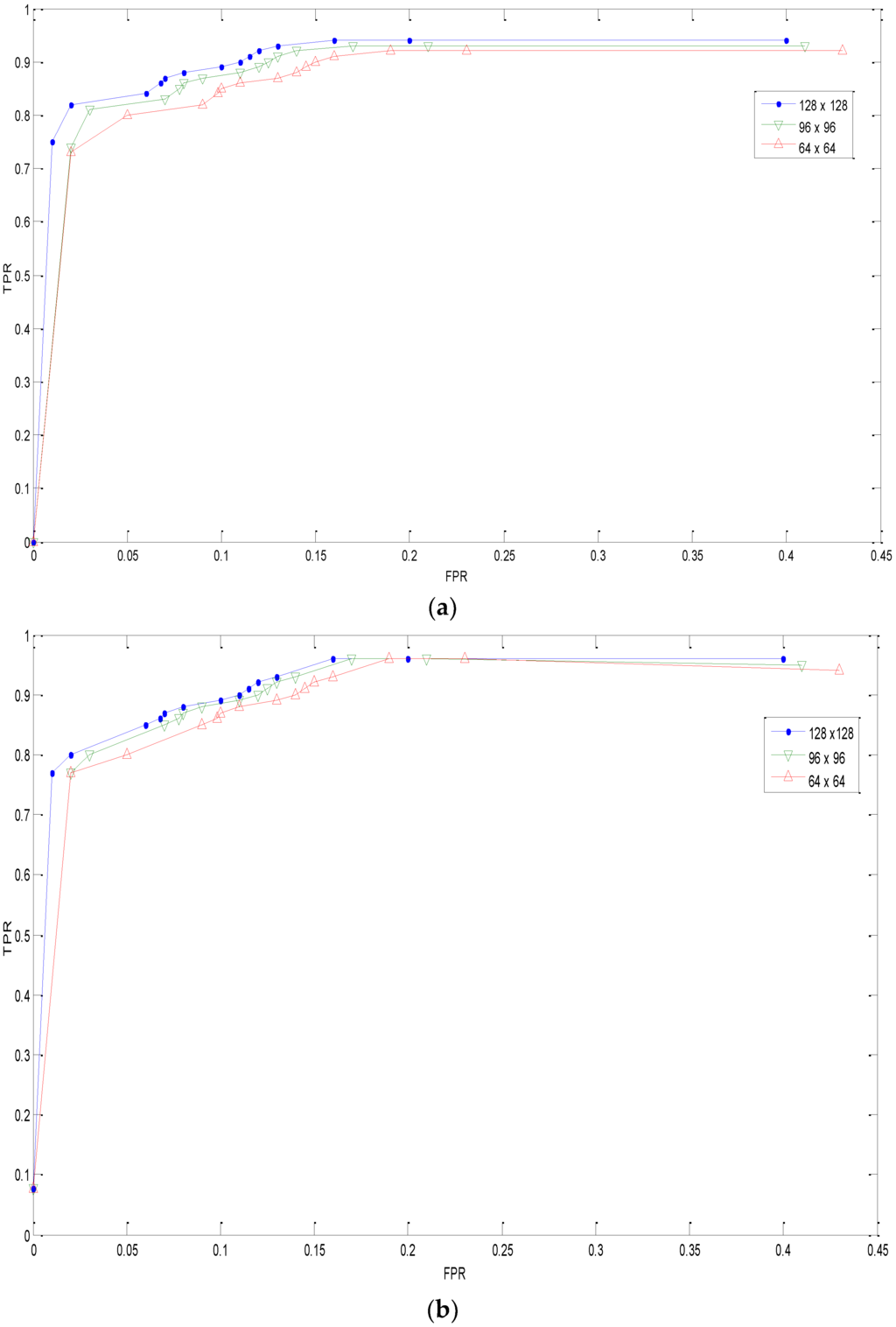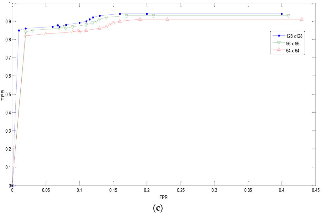 Figure 10 illustrates the TPR and FPR rates that are combined in the receiver operator characteristics (ROC) curve to show the performance of our method that is subjected to various kinds of post processing operations and sizes of duplicated regions. Under different image region sizes, our method performs well with high accuracies at low positive rates. For instance, in the case of normal copy–move forgery, we allowed for random increments in image region sizes ranging from 64 × 64 to 128 × 128 pixels. It can be seen that our method provides TPR greater than 90% and FPR less than 0.08. Furthermore, in the case of forgeries with rotation, our method gives better performance with TPR greater than 85%. In Figure 10c, it can be seen that the performance tends to give high FPR with increasing scaling factor. This is probably due to the greater loss of Harris corner points being caused by scaling operation, which makes it difficult for matching processes to work. Nevertheless, TPR and FPR are acceptable even with high scaling factors. The reason for the overall improved performance is partly due to the fact that the features that we use are also intended to be rotation invariant.