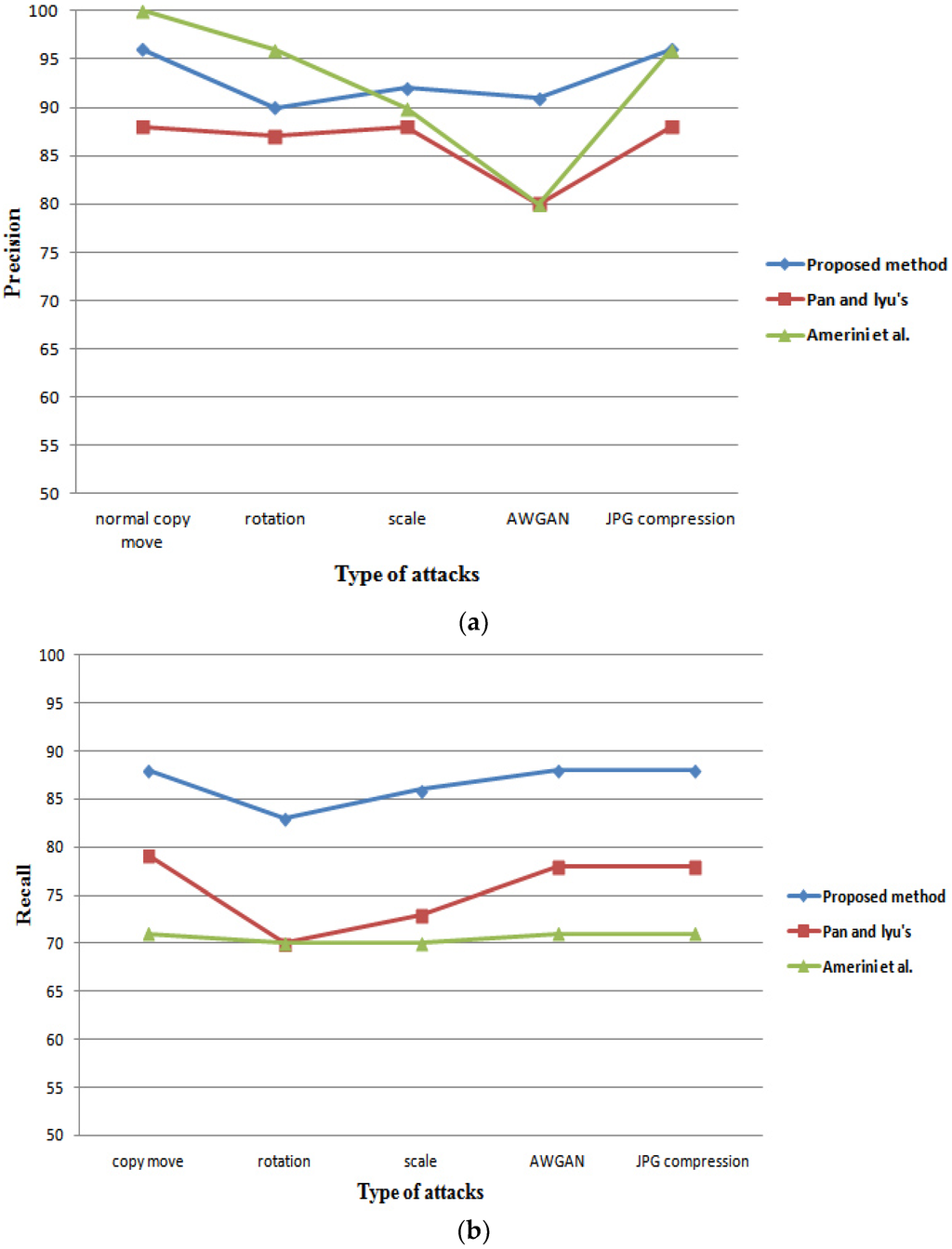 Comparison of detection performance in Precision and Recall of the proposed method, Pan and Lyu’s method [38], and the Amerini et al. method [18].