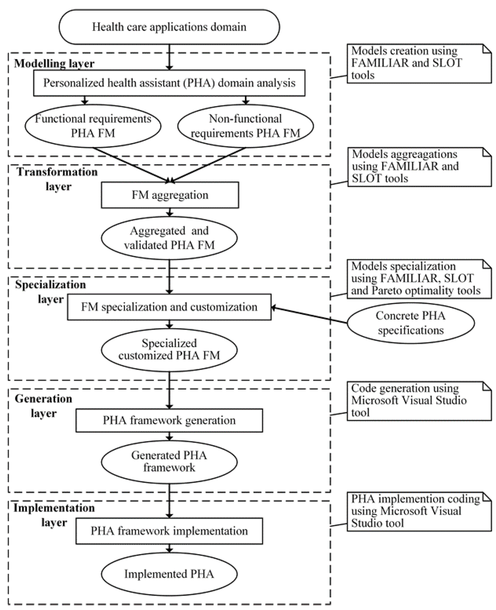 - Though the proposed framework has been implemented as prototype oriented to the use in PHM applications, it is general enough and can be helpful for developing other medical applications as well. The following attributes ensure that: (a) feature modeling and model transformations are independent upon the applications because the process Microsoft Visual Studio tools support the product line vision, i.e., it ensures a high extent of variability in creating related systems; (b) narrowing the variability space through the model specialization enables to adapt requirements to the needs of the possible use; and (c) the implementation covers the full design cycle, in which the product line concept is preserved until the need to create the concrete software part for the specific application hardware arises.