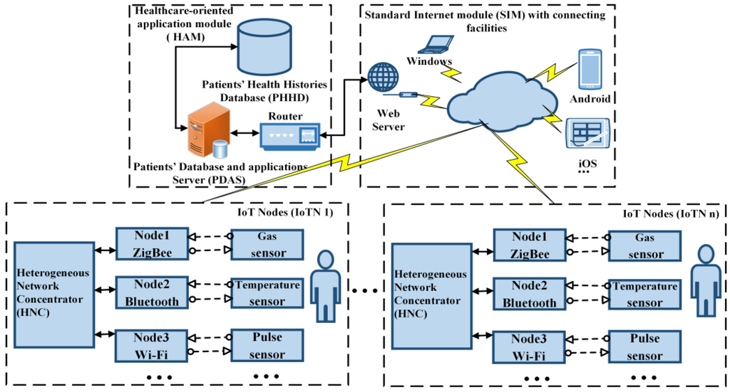In Figure 3, we present the three-level reference architecture of the prototype as a result of healthcare domain analysis. Its highest level contains PHM application module (HAM) with adequate facilities (e.g., patients’ health histories database (PHHD), patients’ database and application server (PDAS)). The standard Internet module (SIM) with connecting facilities represents the intermediate level. The distributed wireless sensors network (DWSN) represents the lowest level. The latter is identified as the IoT Node or IoTN for short. In fact, it represents a sub-net of the DWSN along with additional facilities. In terms of our application, it is treated as a PHM or another medical-related system. As we focus on data collection, communication, and functional aspects here, the module IoTN represents the core of the reference architecture. The module is responsible for providing the initial data. In healthcare applications, there is a need to collect a huge number of data from different parts of the patient’s body. In case of the prototype, however, it is more important to focus on two aspects: (1) typical measurements (e.g., measuring the patient’s temperature, blood pressure, pulse, gases) and (2) different functionality of the sensors used for measuring. As the body parameters of each patient may be specific, we need to have sensors for different functionalities. Therefore, we assume that there are (i) simple sensors that are able to transfer the measured data only (say, measurement of gases); (ii) functional sensors with the restricted functionality (say, measurement of temperature); and (iii) multi-functional sensors to provide various calculations before transferring data (say, measurement of pulse).