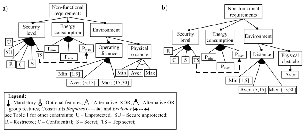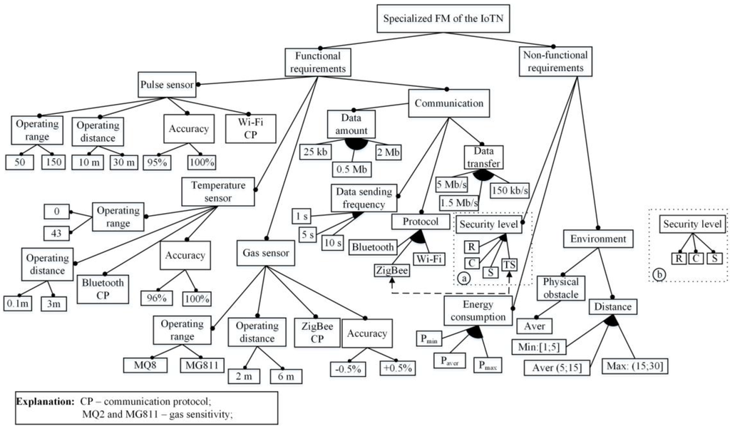 In Figure 4, we present the feature model (FM) that specifies a set of the non-functional requirements with the focus on the security, energy, and environmental aspects as related to the component IoTN. Those aspects are considered as mandatory features (see Section 3.1, for this and other definitions). All the features are decomposed to achieve the level of atomic features (variants). The variation points and variants specify variability (Figure 4, e.g., Security level, Physical obstacle, etc.); therefore, the requirements cover the set of the possible alternatives in representing requirements for different systems. The variants can be also treated as fuzzy variables because of the lack of preciseness. The values of the variables are to be selected using either expert knowledge or previous knowledge of the designer. For example, values of the security level were taken from [31]; the others were estimated on the basis of the experimental results given in [18]. Here, physical obstacle values (Min, Max, Aver) mean the environmental factor influencing to signal transferring (noise) in rural regions, city regions, and between adequately.