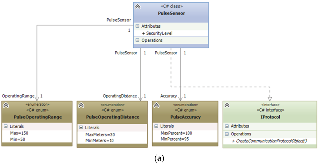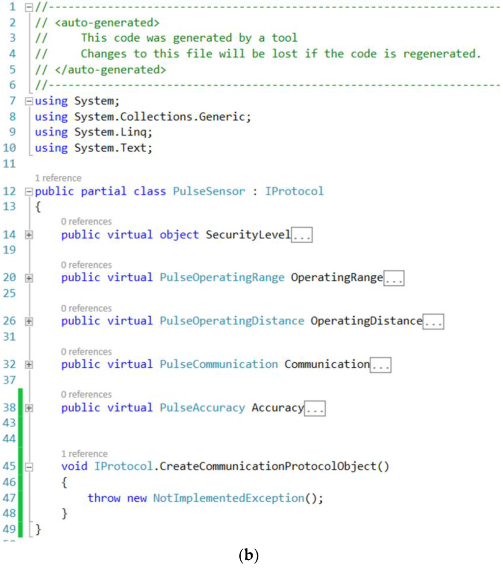 In Figure 6, we present the OOPL class diagram fragment (a) and the generated C# code (b). Here, the class diagram PulseSensor corresponds to the FM fragment “Pulse sensor” (see Figure 5). In Table 3, we summarize the overall results (i.e., the main characteristics of the transformation process) gained at the generation phase. It is important to highlight some characteristics of the process. For example, the automatically generated code covers the eight possible configurations (products in terms of product line). A great deal of code either does not require human intervention at all, or the manually written code is minimal. However, the physical implementation of the concrete sensor functionality requires a substantial number of lines of code (LOC) to be written manually (see the three last lines in Table 3) for the customized concrete configuration. However, in this regard, one should take into account the fact that the designer has a template telling him/her where the code should be placed and what code must be created. The latter is the significant enforcement of the design productivity.