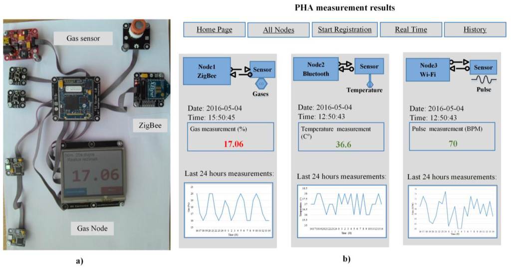 The views of the implemented hardware of the gas sensor (a) and real-time measurements and measurements history for monitoring over the Internet by the remote user (b).