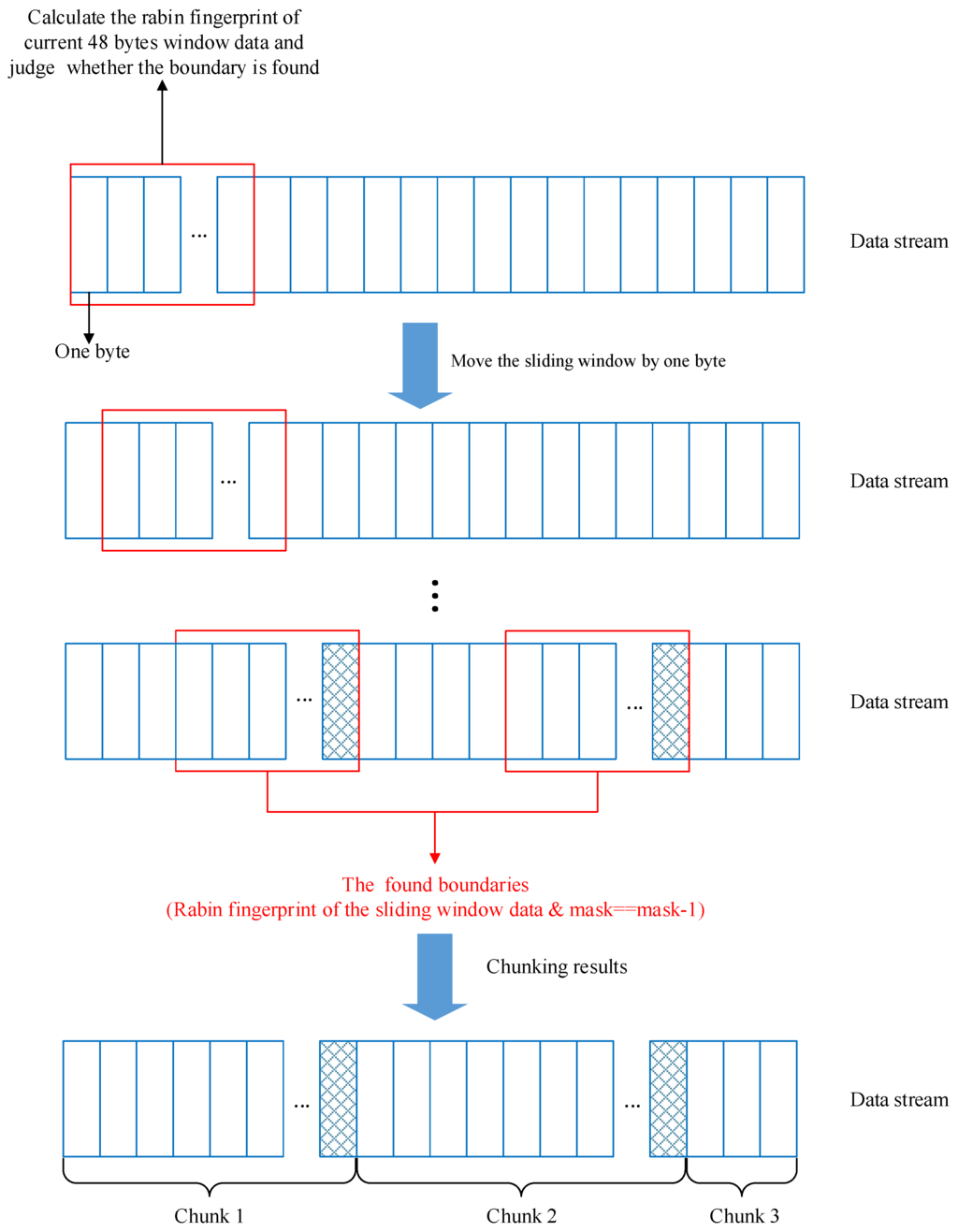 If the condition is met, the last byte of the current window is used as the boundary of the chunk. After the window sliding finished, the formed boundaries divide the data stream into a series of data chunks with variable lengths. To avoid the chunks being too large or too small, the maximum and minimum value of the chunks need to be set. The window slides from a minimum chunk size position, and if the chunk size is bigger than maximum, the last byte of the current window is set as the boundary enforced.