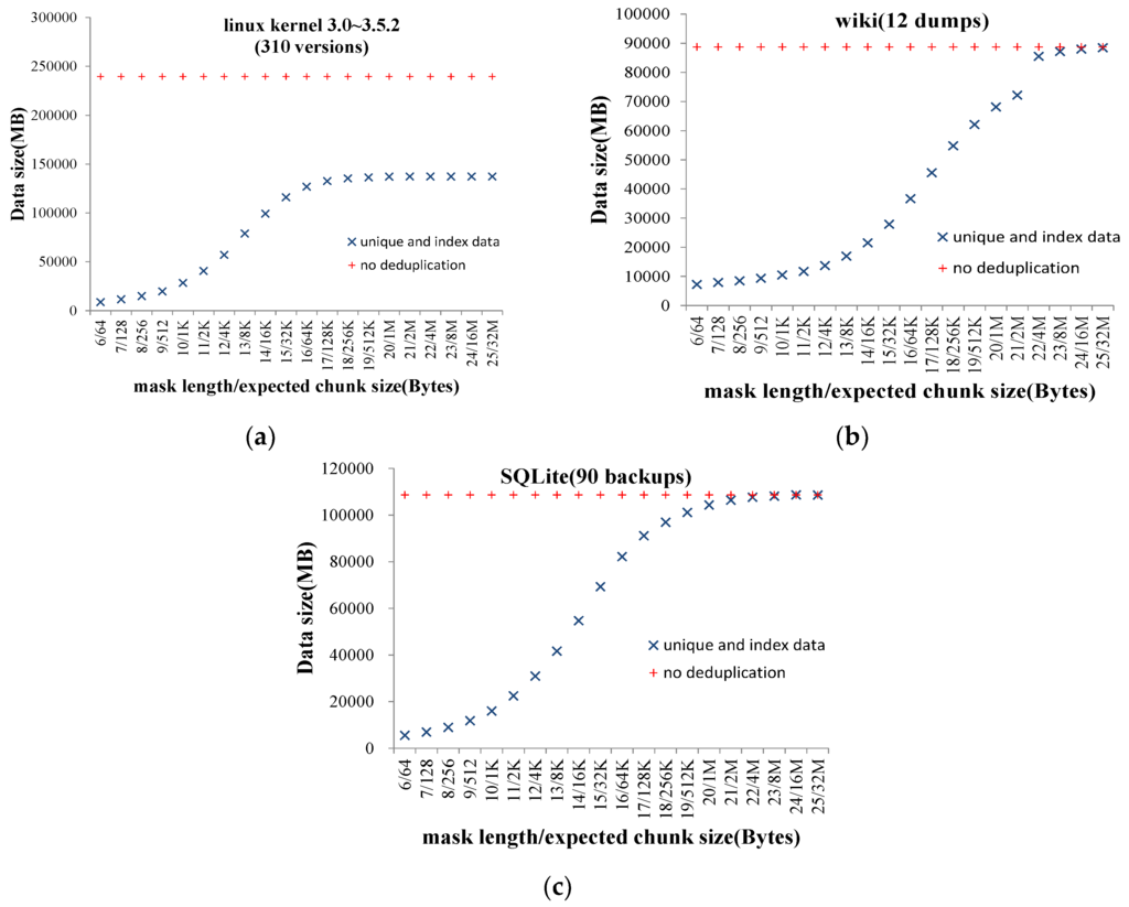 The curve of the relationship between the unique data size and the expected chunk size. (a)linux kernel source codes; (b) wikipedia dumps; (c) SQLite backups.