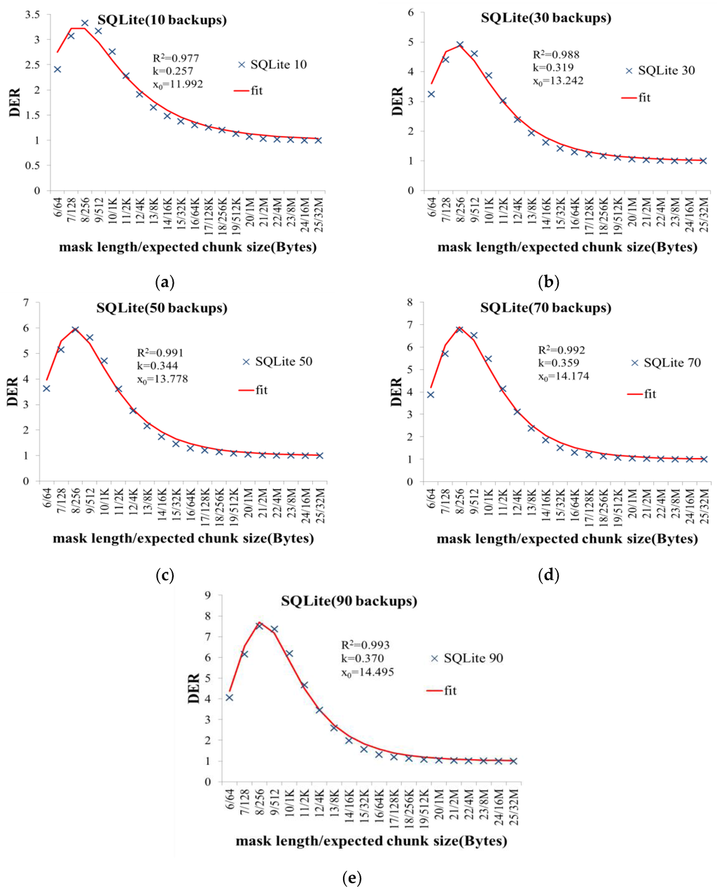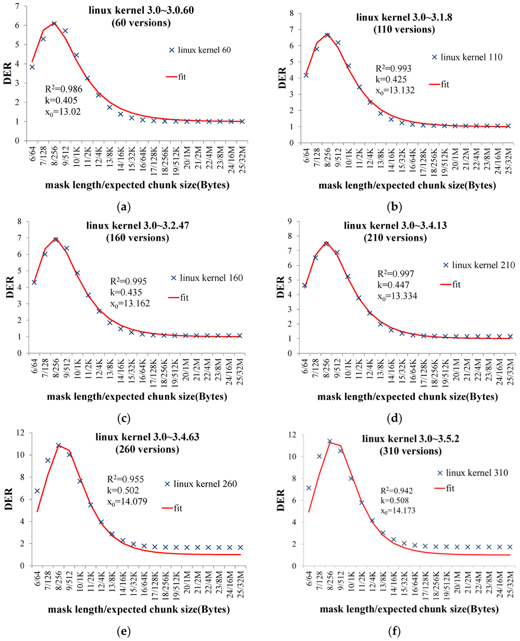 We use R2 value to reflect the goodness of fit of the mathematical model that describes the relationship between the DER and the expected chunk size. The range of R2 is 0~1. The closer the R2 is to 1, the better the goodness of fit. The experimental results show that the R2 values of the experiments are above 0.9, validating that the mathematical model can correctly reflect the relationship between the DER and the expected chunk size.