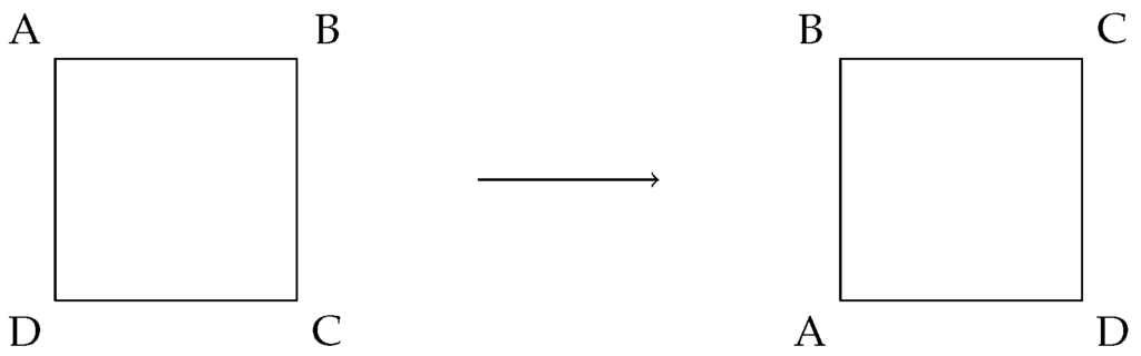The group has eight elements, four rotational symmetries and four reflection symmetries. The rotations are 0, 90, 180and 270, and the reflections are defined along the four axes shown in Figure 1. We refer to these elements as . Note that the identity element is rotation by 0and that for each element, there is another element that has the opposite effect on the square, as required in the definition of a group. The group operation is the composition of two such transformations. As an example of one of the group elements, consider Figure 2, where we demonstrate rotation by 90counterclockwise on a square with labeled corners.