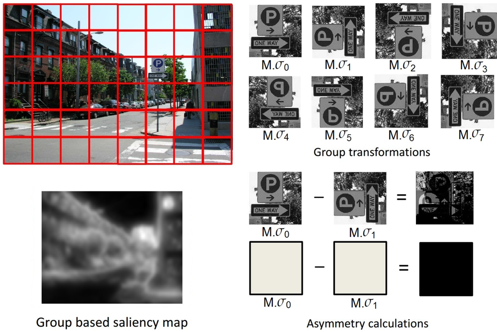 In a recent study by Alsam et al. [24,25], it was proposed that asymmetry can be used as a measure of saliency. In order to calculate the asymmetry of an image region, the authors used dihedral group , which is the symmetry group of the square. consists of eight group elements, namely rotation by 0, 90, 180 and 270 degrees and reflection about the horizontal, vertical and two diagonal axes. The saliency maps obtained from their algorithm show good correspondence with the saliency maps calculated from the classic visual saliency model by Itti et al. [26].