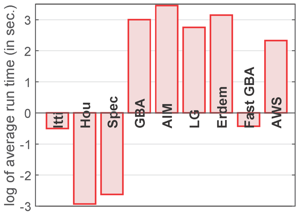 Next, we compare the average run times (for 463 landscape images) of the saliency models that rank at the same or better than Itti, i.e., the classic saliency model. For a better visualization, we use the natural logarithm of the average run times. For this, we used MATLAB R2015 on a 64-bit windows PC with a 3.16-GHz Intel processor and 4 GB RAM. From Figure 6, we observe that the algorithms Hou, and Spec are the fastest. However, among the top six algorithms, the proposed fast GBA model is the fastest. Furthermore, it shows that Fast GBA is nearly 31-times faster than the original GBA algorithm. It is important to note that the original GBA algorithm is crude in implementation, i.e., the eight group transformations are performed iteratively and kept in the memory. In the fast GBA model, reducing the computational complexity (by employing the steps mentioned in Section 3.2) also reduces the memory and software complexity of the proposed model, which is reflected in the results.