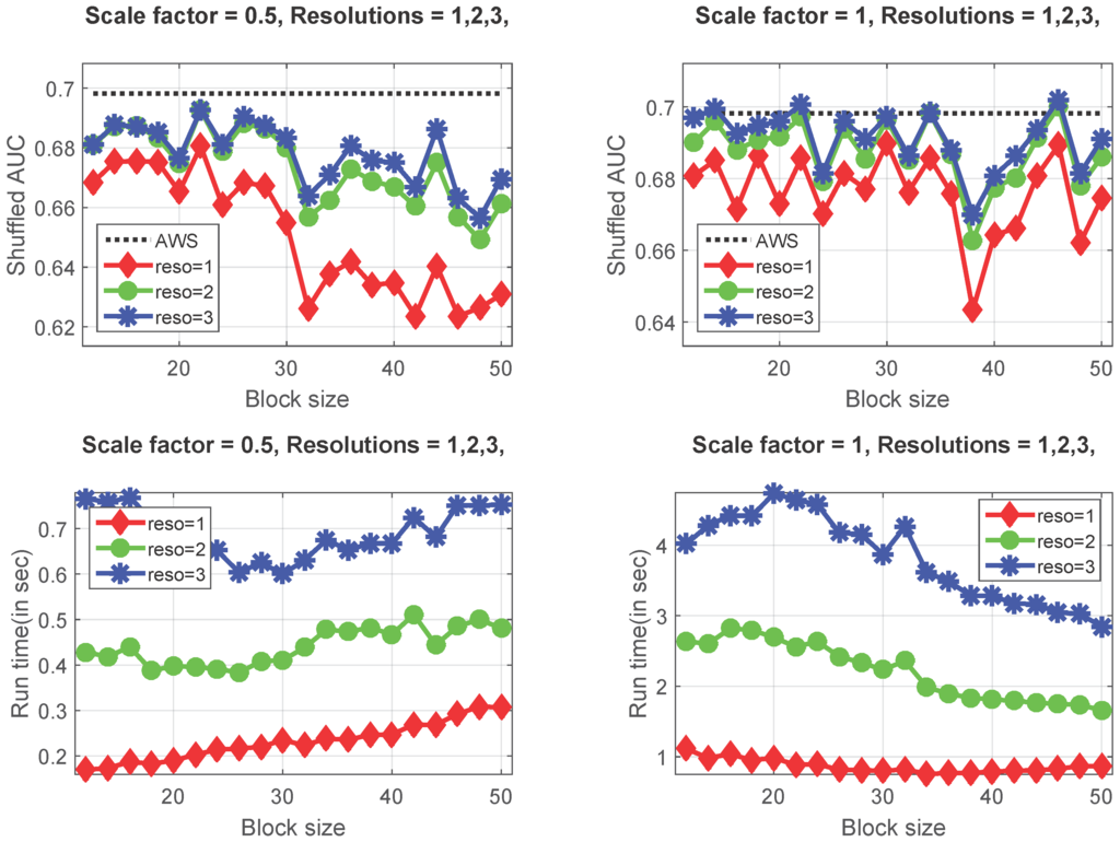 The performance of the proposed model is influenced by the choice of parameters, such as block size, which depends on the size of an average image in the database used for testing. To find the optimal parameters for our algorithm, we use three variables: image scaling factor (which rescales the original image in order to reduce the number of calculations), block size b and number of resolutions (different resolutions to capture local and global details). For this analysis, we use (half size) and , b in the range [12, 50], and 1, 2 and 3. The results obtained by using the shuffled metric for the three variables are shown in the first row of Figure 7. The figure on the top-left shows the shuffled values for , with the red, green and blue lines depicting as 1, 2 and 3, respectively, while the figure on the top-right shows the shuffled values for . In the second row of Figure 7, we depict the average run time of the algorithm for the different values of , b and . The results indicate that: First, increasing the number of resolutions improves the performance of the proposed model. Second, based on the figures in the second row, we note that using (i.e., working with an image of half the original resolution) reduces the run time to less than one second. Third, we observe (in the figure on the top-right) that the shuffled values for our algorithm exceed the values obtained from the AWS model (i.e., the best saliency model, represented by the black dashed line) for the following parameters: , , , and , , . In other words, using the optimal parameters (mentioned above), our proposed model outranks the best saliency model in the literature; however, we believe that the differences between the top 5 algorithms (AIM, LG, Erdem, fast GBA and AWS) are too small to rank one as the best over the rest. Fourth, from the figure on the bottom-right, we note that using the optimal parameters increases the run time to a few seconds (a minimum of 1.7 to a maximum of 4.7 s), which are still faster than the run time of the AWS model (i.e., 10.2 s). Please note that in order to highlight the intrinsic nature of the fast GBA model, no GPU computing was employed.