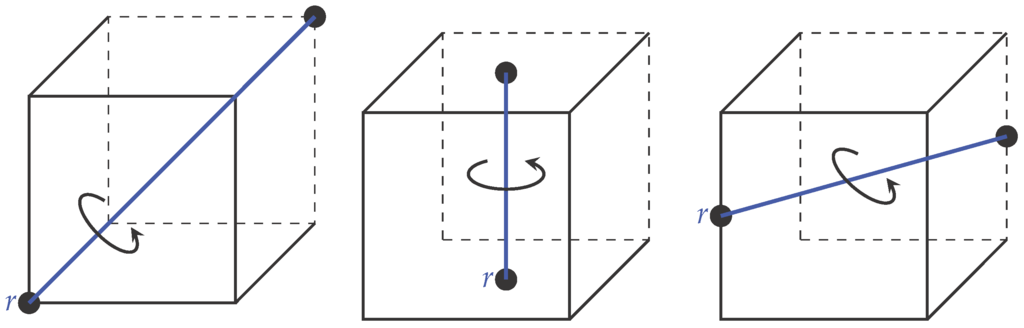 A cube has 48 symmetries that can be represented by the transformations of products of the groups and . is the symmetric group of degree two and has two elements: the identity and the permutation interchanging the two points [28]. is a symmetric group of degree four, i.e., all permutations on a set of size four [28]. This group has 24 elements that are obtained by rotations about opposite faces, opposite diagonals and opposite edges of the cube. For instance, Figure 9 shows the different rotational symmetries of the cube. We note that from the rotations along opposite diagonals, faces and edges, we get 8, 9 and 6 elements, respectively. These elements along with the identity form the 24 elements of the group.