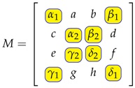 For the rest of the entries, first, we can look at . This element will only be possible if we flip the matrix about the vertical axis. This will result in two parts in the sum, and , giving a factor 2. Here, a and b represent a reflection symmetric pair, and all other reflection symmetric pairs will behave in the same way. Now, let us focus on . This represents a rotational symmetric pair. Rotating the matrix counterclockwise will move d onto the position of a giving a part in the sum. Rotating clockwise gives us . As these differences are not plausible in any other way, this gives us a factor of 2. All other rotational symmetric pairs will behave in the same way. This means that the asymmetry for the rest of the entries can be calculated as follows: