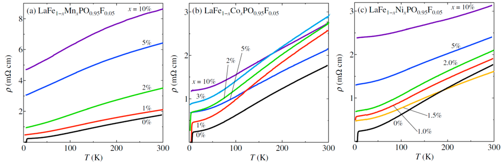Figure 1 shows temperature dependence of electrical resistivity for LaFe1−xMxPO0.95F0.05. The resistivity for all the samples with x = 0–0.10 shows a metallic behavior and the value almost systematically increases with x. The increasing rate of the resistivity value is dependent on the impurity, and the resistivity for the samples with M = Mn is much more strongly enhanced than in those with M = Co and Ni. The different ratio of the resistivity enhancement with x may be related to the ground states for each end member. LaMnPO is a semiconductor, and resultantly the Mn substitution to this system causes a large change of resistivity [21]. On the other hand, LaCoPO and LaNiPO are metal, as is LaFePO0.95F0.05, and the resistivity for the Co- and Ni-doped samples shows a smaller change with the increasing x [22,23].