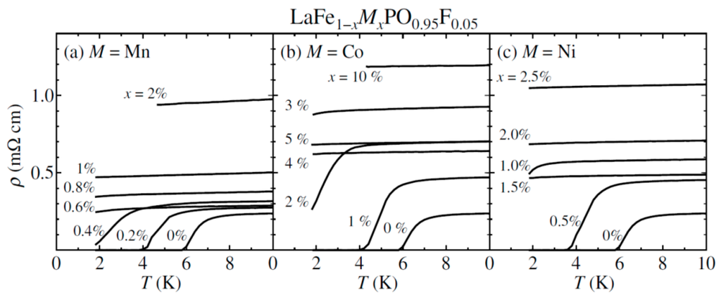 Figure 2 presents the low-temperature part of the resistivity for LaFe1−xMxPO0.95F0.05 with low xs. The impurity doping enhances the residual resistivity almost monotonically, indicating that the impurities are successfully introduced into the Fe site of LaFePO0.95F0.05. On the other hand, Tc is systematically suppressed with x, and the SC transition almost disappears around x = 0.8% for M = Mn, x = 3.0% for M = Co, and x = 1.5% for M = Ni, respectively.