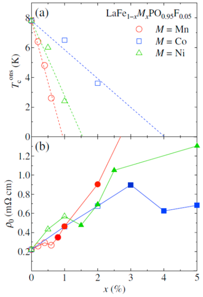 (a) x dependence of Tcons for LaFe1-xMxPO0.95F0.05 with M = Mn (red circles), Co (blue squares) and Ni (green triangles), respectively. The broken lines indicate linear fitting results; (b) x dependence of residual resistivity (ρ0) in the normal state for SC (open symbols) and non-SC (closed ones) samples. The resistivity for the 3% Co-doped sample shows a small drop due to resistive transition at low temperatures, as seen in Figure 2b. The low-temperature drop of resistivity for this sample is too small to determine Tcons by using the definition of Tcons in the present work. In this figure, we regard the 3% Co-doped sample as the non-SC one, but this sample may show an SC transition below 1.8 K.