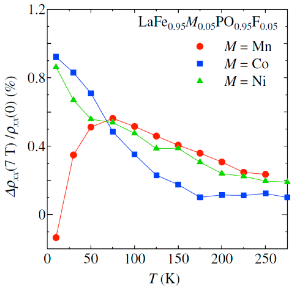 In order to clarify the magnetic feature of the doped impurities, we have measured the temperature dependence of longitudinal magnetoresistance at a magnetic field of H = 7 T for the x = 0.05 samples, which show no superconductivity down to 1.8 K. As shown in Figure 4, the magnetoresistance for Mn-doped LaFePO0.95F0.05 shows a different behavior from the cases of Co and Ni doping at low temperatures. The magnetoresistance remains positive down to the lowest temperature for Co- and Ni-doped compounds, while its sign turns negative for M = Mn. In general, the negative magnetoresistance appears when the charge carriers are scattered by the magnetic ions in the compounds. Therefore, the results of the magnetoresistance indicate that Co and Ni play as nonmagnetic impurities in the present system, while Mn as a magnetic one. This is consistent with the previous studies for Co- and Mn-doped BaFe2As2 which have pointed out that the doped Co does not create any localized magnetic moments, but Mn plays as a magnetic impurity in the Fe layer [24,25,26].