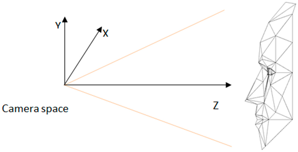 The Kinect face tracking SDK uses the Kinect coordinate system to output its 3D tracking [42]. The origin is located at the cameras optical center (sensor), Z-axis is pointing towards a user, Y-axis is pointing up as shown in Figure 1. The face tracking SDK tracks faces in 3D based on the AAM and depth data, and provides 121 feature points on a face. By using face tracking SDK, we detect face and those coordinates of the 121 facial feature points from successive two frames [(a) in Figure 2]. Among them, we selected 31 main significant points based on Ekman’s action units as shown in Figure 3b [(b) in Figure 2]. In the selection of 31 main points, we excluded facial contour points that are irrelevant to facial expression muscles.