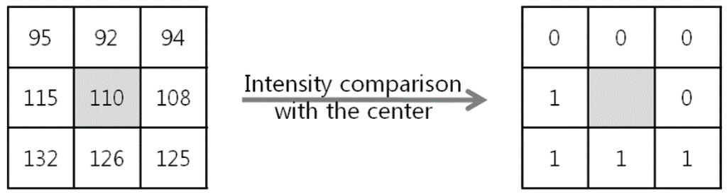 To analyze the facial muscle movement between successive frames, we measure variations of a pixel value in each feature point. However, natural subtle vibrations of humans could be an inaccurate factor in the measurement of pixel values at the same position. Thus, we performed the alignment step named shift-matching scheme before the pixel value measurement [(c) in Figure 2] [43]. First, two surrounding regions (10 × 10 pixels) of each feature point were cropped in two successive frames. Then, we applied a local binary pattern (LBP) operator to define facial texture information [44]. The LBP is an efficient texture operator that assigns a label to pixels by thresholding the 3 × 3 neighborhood of each pixel based on the center pixel value and presents the result as a binary number as shown in Figure 4.