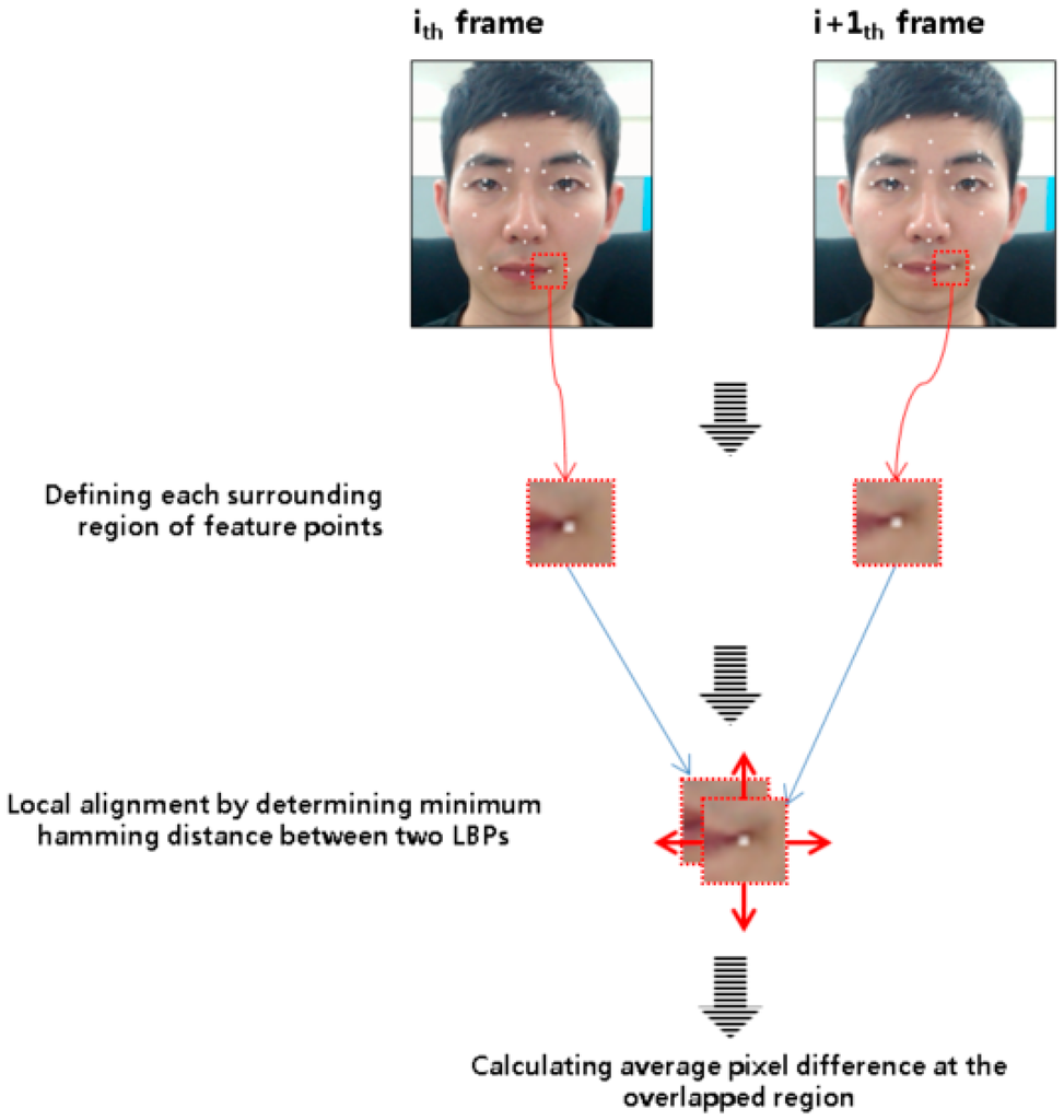 The minimum Hamming distance means that the two surrounding regions are almost the same. Figure 5 shows the conceptual diagram of the facial feature alignment method.