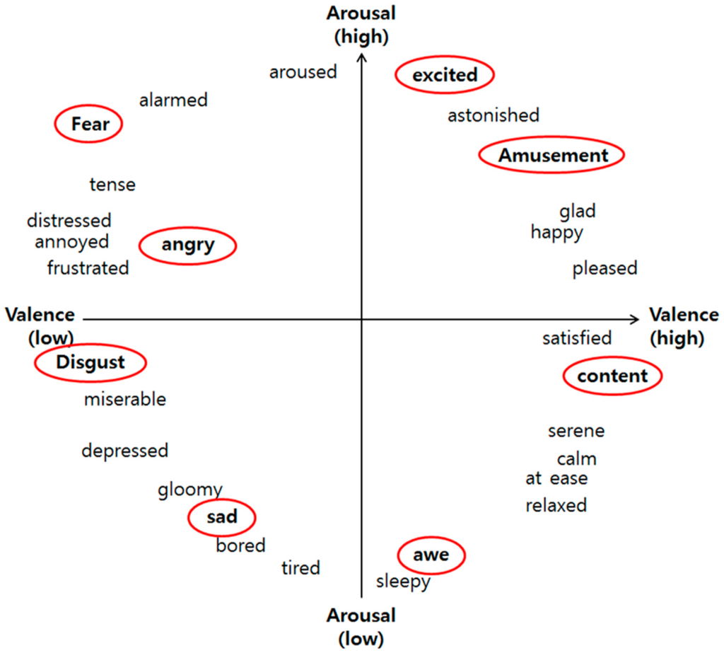 We tested 30 participants (15 men and 15 women) aged between 24 and 35 years old (men: Mean = 27.8, Standard deviation = 2.9; women: Mean = 27.0, Standard deviation = 2.5). We paid each participant $20 for participating and advised them to be prepared for the experiments by resting sufficiently. To elicit emotion, we used two kinds of stimuli. In previous research, the elicited emotion power was estimated using an EEG signal at three modalities: auditory, visual, and combined visual with auditory [19]. Using both visual and auditory stimuli is most efficient for eliciting emotion; therefore, we used a combined visual and auditory modality. We used visual stimuli of artistic photography taken from a photo-sharing site (http://musicovery.com). The artistic photographs were obtained using the emotion categories designated by the artist who uploaded the photo. Additionally, the artistic photographs were verified in terms of their emotion classification at low-level features [47]. These photos show a similar effect to the International Affective Picture System (IAPS), which is most commonly used for visual stimuli [48]. Auditory stimuli were downloaded from a music-sharing site (http://www.deviantart.com). The auditory stimuli at the music-sharing site were located based on Russell’s 2D emotion model, including the arousal-relaxation axis and positive-negative axis. We downloaded the music corresponding with the location of that emotion. Then, we verified the validity of the auditory stimuli via self-assessment. The auditory stimuli validity was verified at 98% reliability. We used a total of eight emotions. Figure 6 shows the mapping using Russell’s 2D emotion model.