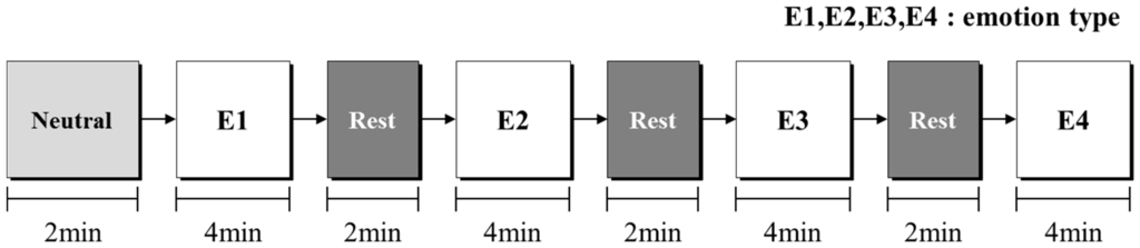 We displayed 50 visual stimuli as a slideshow for each emotion. Each participant used an earpiece to concentrate on the auditory stimulus. The Kinect camera was located at a center position under the monitor in order to capture the front of the face. To remove the order effect, the sequence of eliciting emotion was placed randomly [49]. Participants had 2 min of rest time between emotions. Experimental procedure is shown in Figure 7.