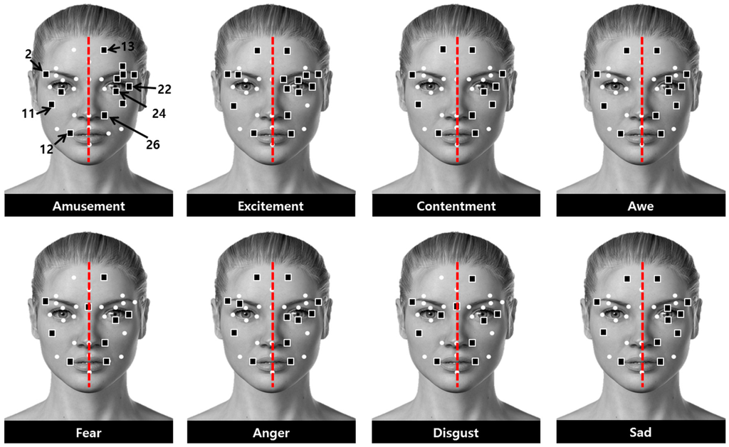 According to the first and second results for men and women, the symmetry issue can be compared. As shown in Figure 8 and Figure 9, the facial feature movements of men and women were symmetrical and asymmetrical, respectively. In particular, the asymmetric phenomena of women appeared more strongly around the left eye region in cases of positive emotions, such as amusement, excitement, contentment, and awe, as shown in Figure 9. This result concurs with the seminal research of Ekman [39].