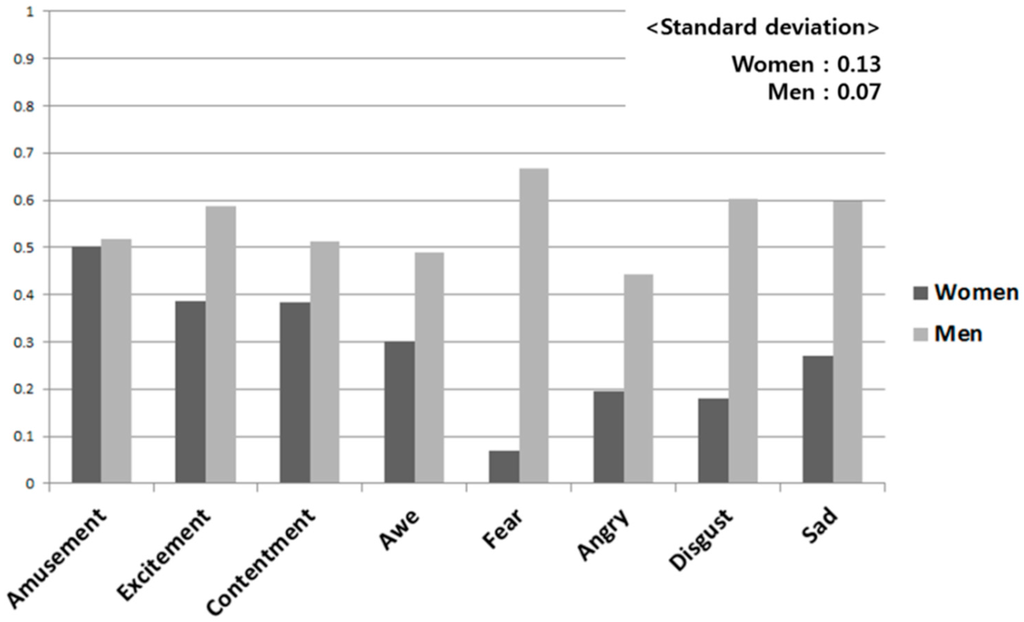 Figure 11 shows the result when individual variation is removed; that is, a positive number means that facial movement shows a larger than neutral emotion and a negative number means that it shows a smaller than neutral emotion. Consequently, the eight emotions all have larger facial movements than neutral. The facial movement average of men is higher compared to women for all emotions. Therefore, men’s facial expressions were more abundant compared to women’s. However, it is insufficient to measure this only using the average. Therefore, we looked at the standard deviations, which were 0.07 for men and 0.13 for women. Women showed a higher amount of distinguishing of emotions compared to men, despite women’s facial movement average being lower compared to men’s. In a previous study, women had more abundant emotion expressions at the brain signal compared to men [50]. We identified a similar result from the standard deviation between the results for men and women.
