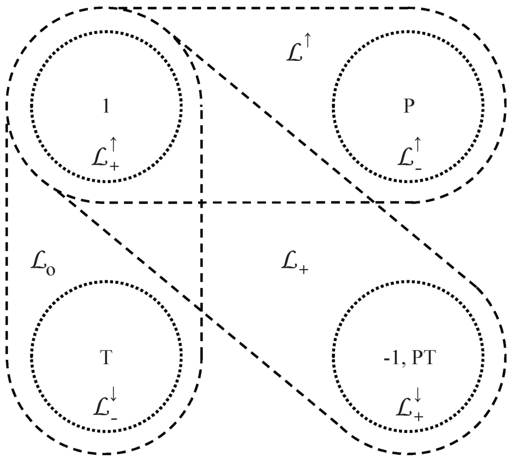 is the identity component of the Lorentz group, containing the identity element denoted in the following simply by ’1’, by , or . contains the space reflection P with ; contains the time reversal T with :