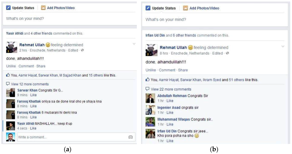 The same newsfeed with updates at the top of a Facebook wall at different times: (a) status of newsfeed after 2 h; and (b) same newsfeed after 8 h with some non-newsworthy updates.